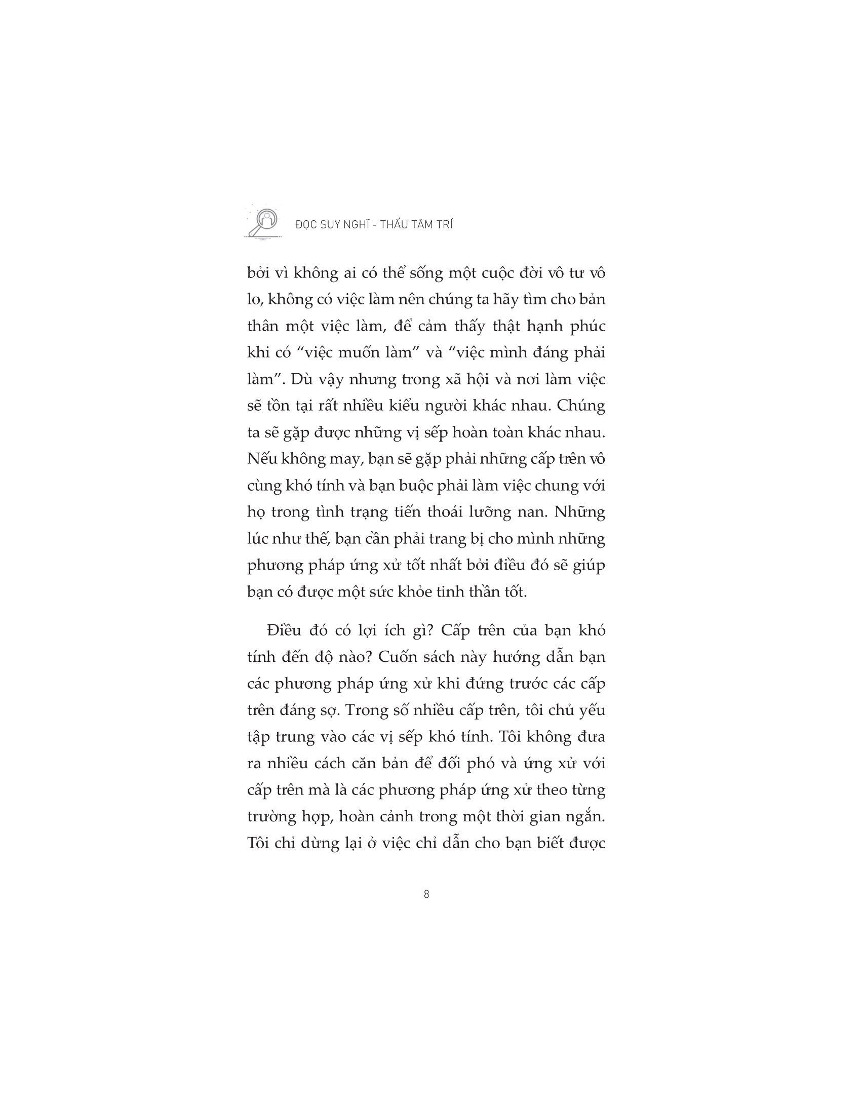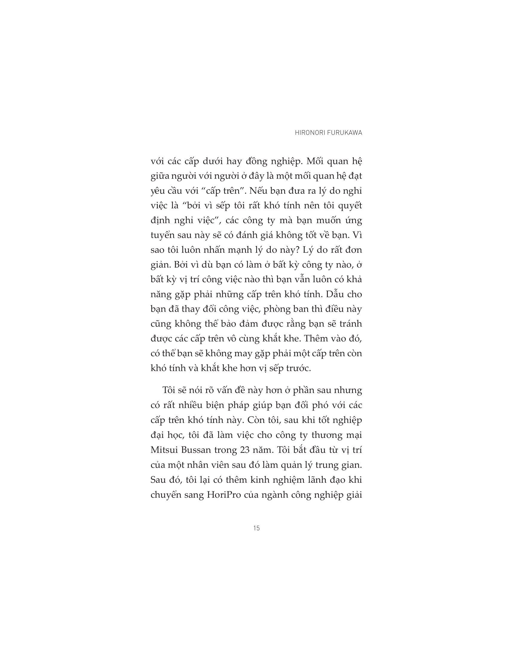 - Không tìm thấy định hướng nghề nghiệp khi làm ở công ty đó Bởi ở bất kỳ công ty nào cũng có các vị sếp “đáng sợ”, vậy nên việc rèn luyện kỹ năng giao tiếp nơi làm việc sẽ giúp các nhân viên trẻ mới đi làm không còn cảm thấy áp lực hay sợ hãi khi làm việc leader. Bên cạnh đó, tác giả cũng hướng dẫn các nhân viên cấp dưới các kỹ năng để nâng cao năng lực bản thân, chủ động trong công việc, tạo dựng được sự tín nhiệm và ủng hộ từ đồng nghiệp và xây dựng mối quan hệ làm việc hiệu quả với các cấp trên và tận hưởng công việc mỗi ngày của m.ình. “Đọc suy nghĩ – Thấu tâm trí” sẽ là tài liệu bổ ích giúp bạn đọc có cài nhìn nhiều chiều hơn về môi trường công sở để từ đó trang bị cho bản thân những kiến thức và kỹ năng cần thiết. Về tác giả: Hironori Furukawa sinh năm 1954 tại Ikeda, Osaka. Ông tốt nghiệp Khoa Thương mại tại Đại học Waseda. Quen thuộc với độc giả về các đề tài mối quan hệ cấp dưới – cấp trên và phát triển nguồn nhân lực, ông hoạt động như một người hướng dẫn đào tạo. Ông tập trung vào cải cách văn hóa doanh nghiệp, nâng cao nhận thức cho người làm kinh doanh và tạo động lực làm việc cho cấp dưới….