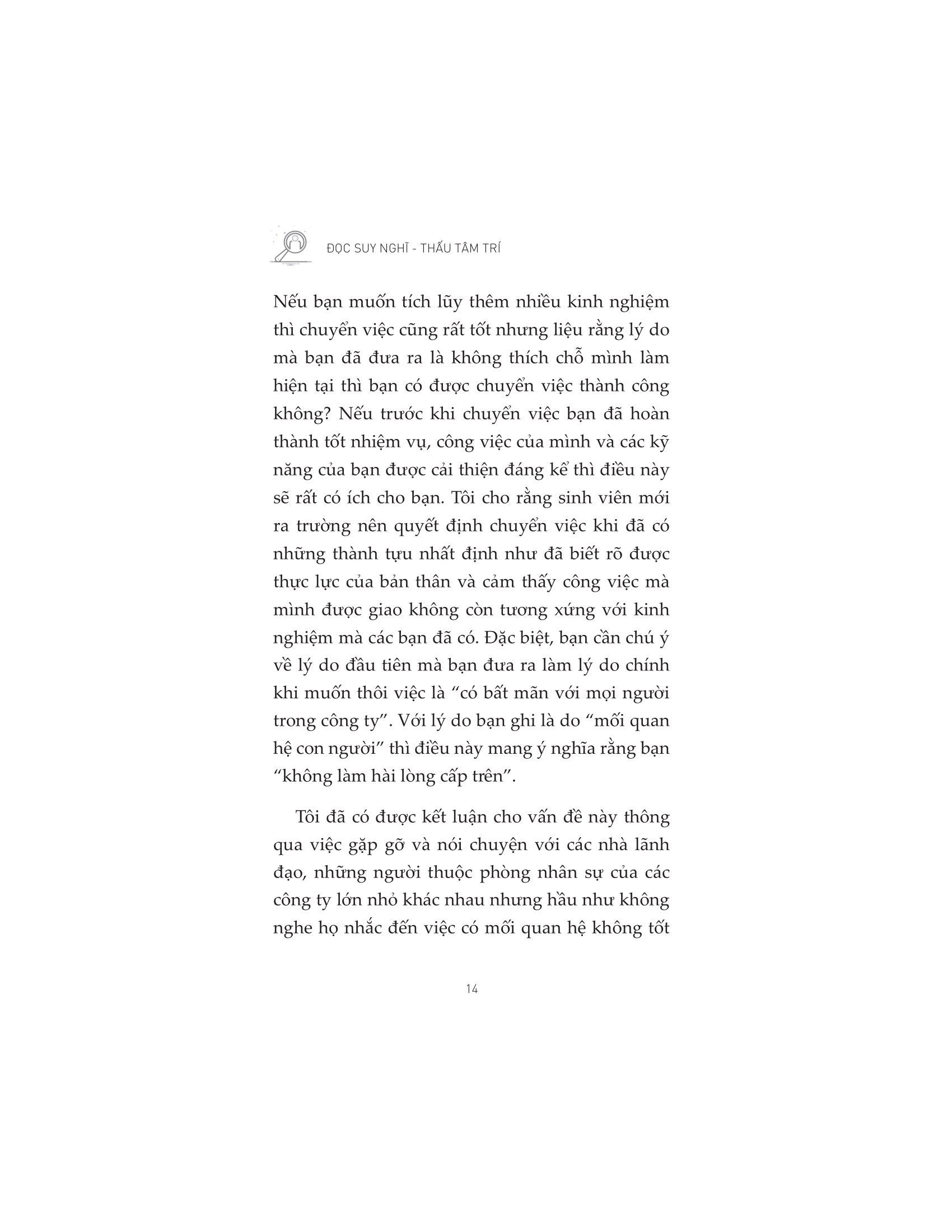 Đọc Suy Nghĩ - Thấu Tâm Trí Hầu hết nhân viên trẻ mới bước chân vào thị trường lao động đều sẽ đối mặt với những khó khăn nhất định trong việc hòa nhập vào môi trường làm việc và văn hóa công ty. Đối với những người làm đầu tiên đi làm, vấn đề lớn nhất có lẽ đến từ từ mối quan hệ với đồng nghiệp và các lãnh đạo trực tiếp cũng như gián tiếp. Khoảng 30% nhân viên trẻ và nhân viên mới rời công ty sau khoảng 3 năm gắn bó vì lý do giao tiếp công việc và áp lực từ cấp trên, nhưng không có gì đảm bảo rằng đến công ty mới họ sẽ không phải gặp lại vấn đề tương tự. Trong cuốn sách “Đọc suy nghĩ – Thấu tâm trí”, tác giả Hironori Furukawa trình bày một số nguyên nhân khiến nhân viên không thể gắn bó lâu dài với công ty: