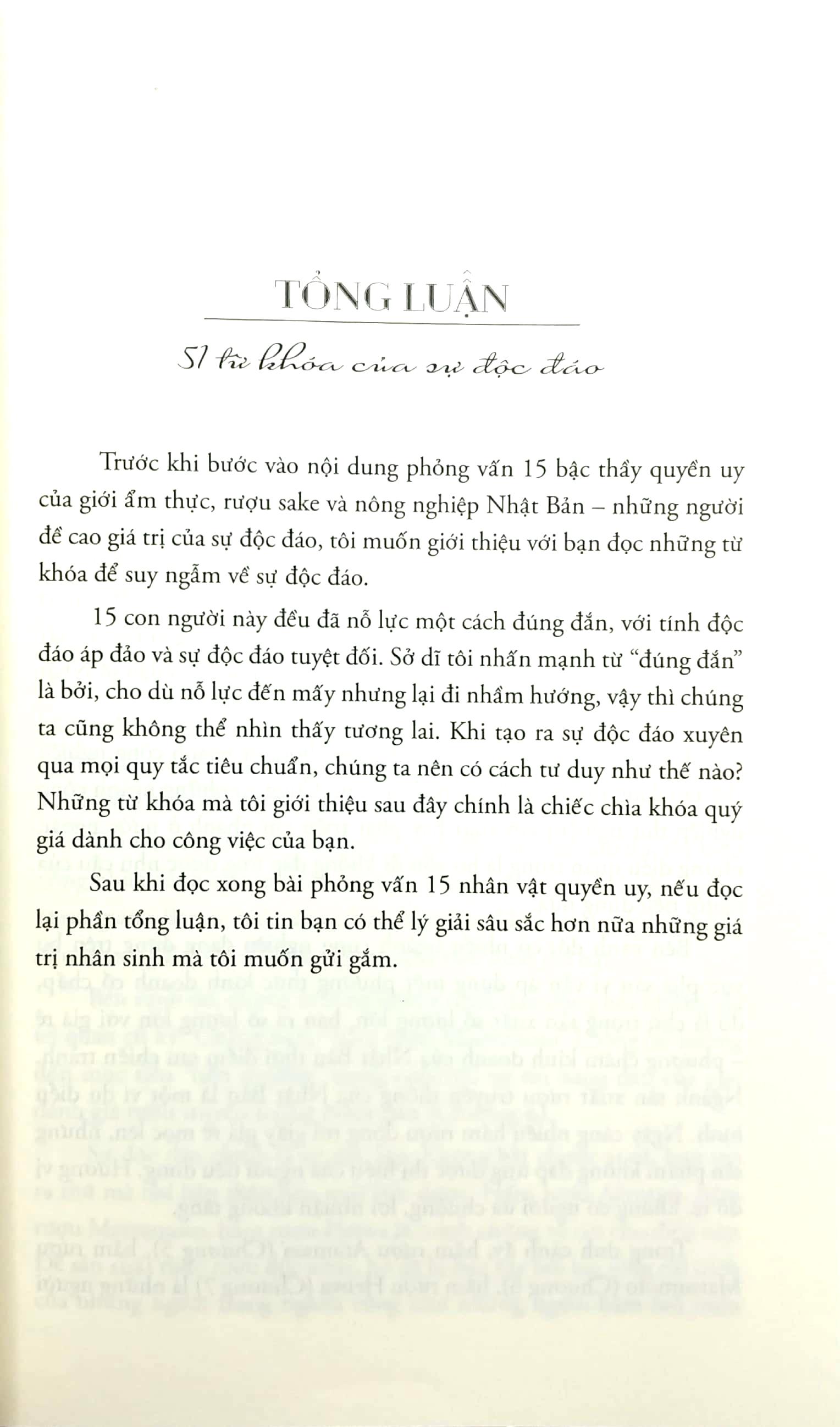 Mua tại TiktokĐộc Tôn Để Trường Tồn 51 bí quyết tạo dựng vị thế độc tôn trong lĩnh vực kinh doanh ẩm thực Cuộc đời của con người chỉ kéo dài khoảng 100 năm, và thời đại mà bất cứ ai cũng phải làm việc đến 70-80 tuổi đang nhăm nhe tấn công chúng ta. Nếu muốn tận hưởng một cuộc đời trọn vẹn, muốn trải qua mỗi ngày trong vui vẻ, vậy thì sở hữu một công việc độc đáo mà chỉ m.ình bạn mới làm được sẽ là chìa khóa quan trọng hơn tất thảy, dù với mục đích kiếm tiền hay bất cứ mục đích nào đi nữa. Thông qua cuốn sách này, tác giả sẽ giới thiệu cho chúng ta những công việc thấm đẫm triết lý của sự độc đáo của 15 nhân vật hoạt động năng nổ trong ngành ẩm thực, rượu sake và nông nghiệp Nhật Bản.
