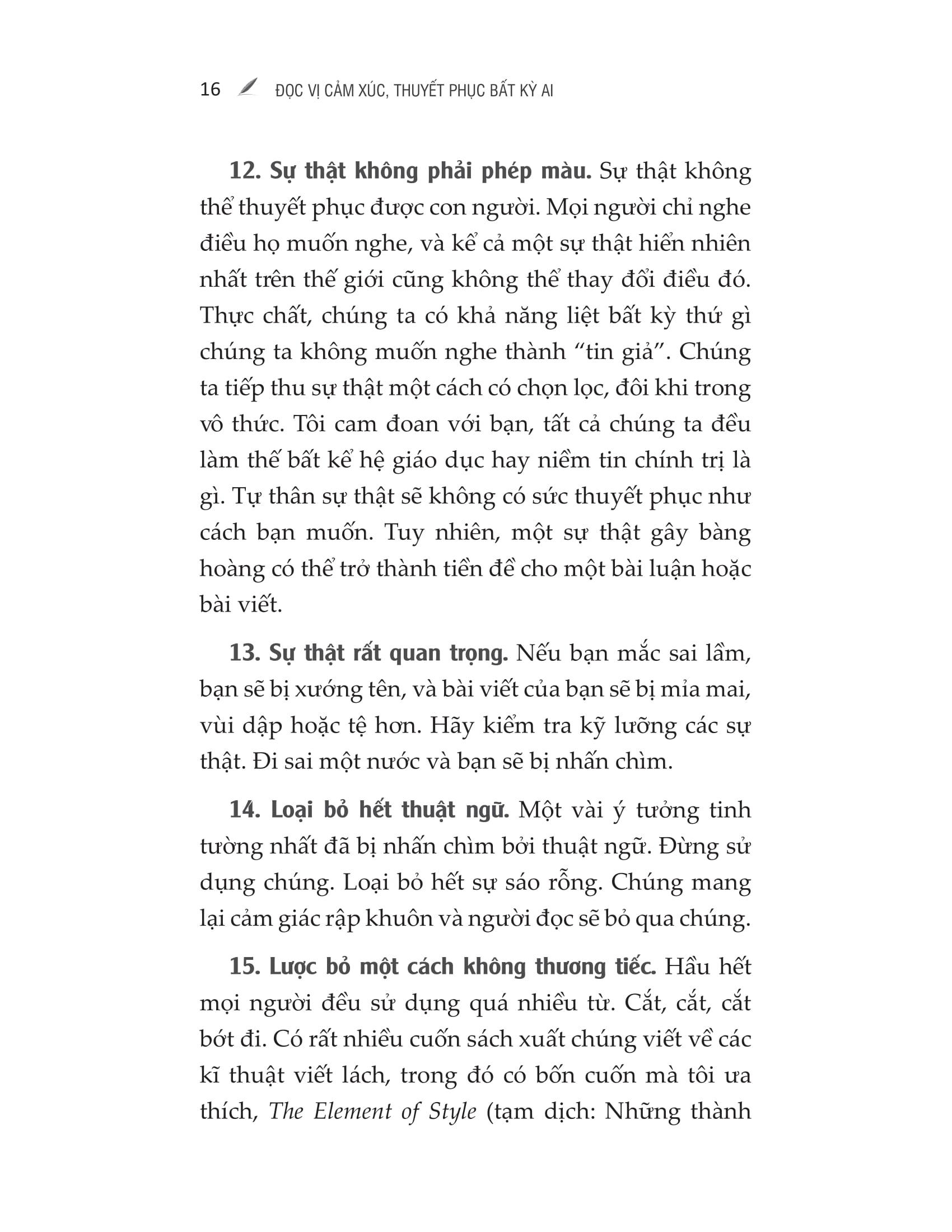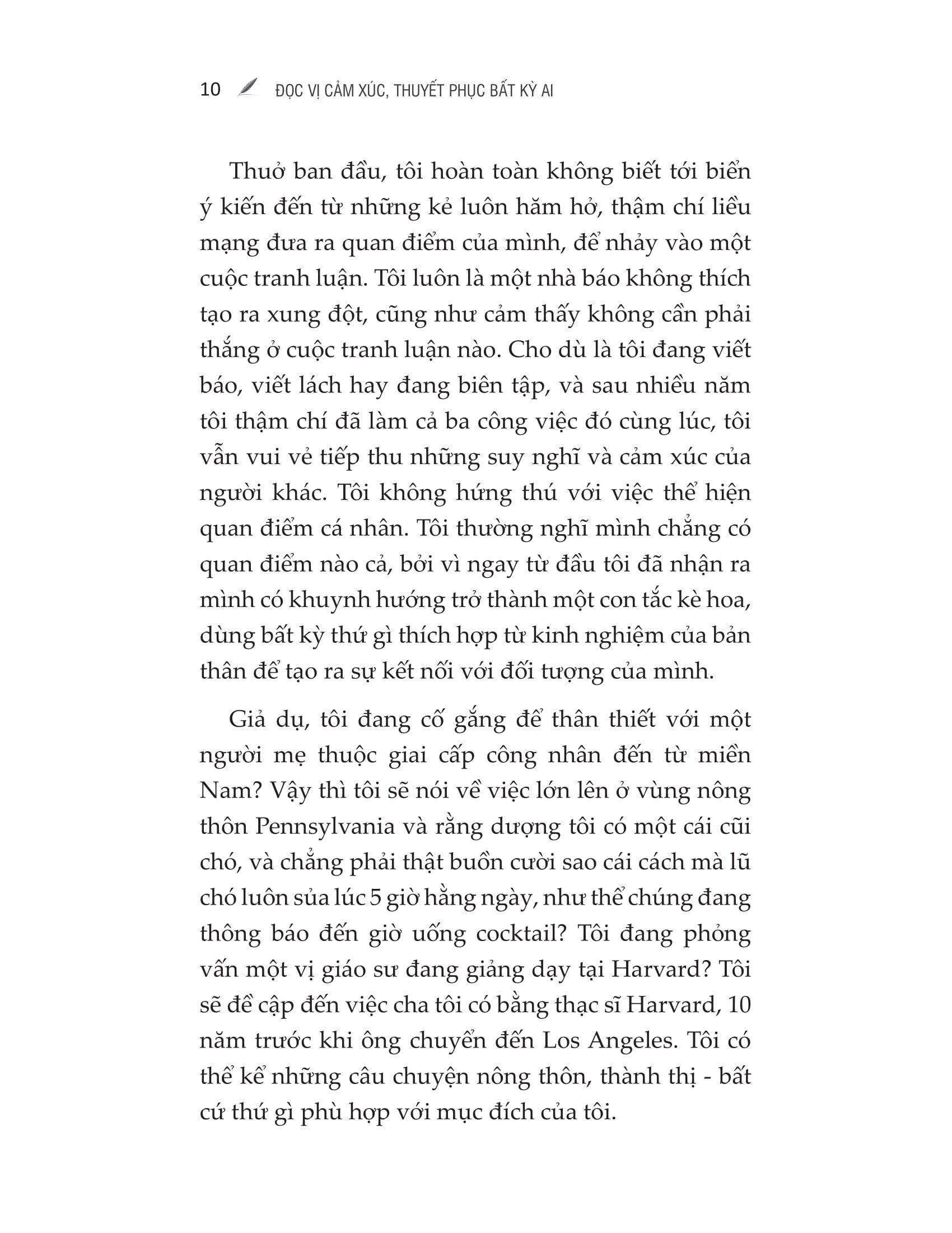 Là người phụ trách mục Góc nhìn cho tờ New York Times, tác giả Trish Hall đã dành nhiều năm đắm chìm trong những cuộc tranh luận và những bài viết thể hiện quan điểm. Trong quá trình đó, cô thường xuyên phải tiếp xúc với những câu văn rối rắm, những biệt ngữ khó hiểu và những bài viết chán ngắt. Dựa trên kinh nghiệm m.ình, Trish Hall đã viết “Đọc vị cảm xúc, thuyết phục bất kỳ ai” để giúp người đọc giao tiếp một cách hiệu quả và thu phục lòng người. Thông qua cuốn sách này, Trish Hall sẽ chỉ cho độc giả cách trình bày ý kiến của m.ình thật thuyết phục, cho dù bạn đang viết một bài luận cho giáo sư tại trường đại học, một ứng tuyển việc làm, hay cần thuyết trình về kế hoạch của m.ình tại nơi làm việc. Mặc dù cuốn sách chủ yếu là về viết lách, tác giả đã chèn thêm các yếu tố tâm lý học để làm luận chứng cho những phương pháp mà cô đưa ra. Hiểu biết về hành vi của con người sẽ rất hữu dụng khi giao tiếp trực tiếp. Vậy thì, bạn có thể hỏi, có luật lệ nào cho việc tranh luận, tạo niềm tin và thuyết phục người khác nên nghe theo bạn không? Có chứ. Mặc dù rất khó để thay đổi tâm trí, vẫn có những nguyên tắc cơ bản để tạo niềm tin, các kĩ thuật để lôi kéo mọi người về phe bạn, không chỉ trong những cuộc tranh luận mà còn trong cuộc sống. Giống như rất nhiều những luật lệ khác, chúng không dễ để tuân theo. Và cũng giống như tất cả những luật lệ khác, chúng hoàn toàn có thể bị phá vỡ. Bạn có thể vi phạm tất cả những khái niệm và vẫn thuyết phục được ai đó nhìn nhận quan điểm của bạn. Nhưng hãy yên tâm rằng việc sử dụng những biện pháp này, cho dù nó đòi hỏi tính nghệ thuật, kĩ thuật và một sự am hiểu tâm lý con người, sẽ tăng xác suất thành công của bạn.