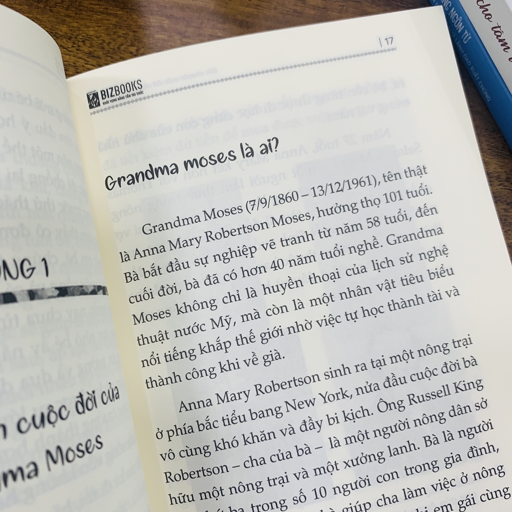Grandma Moses là nhà nghệ thuật dân gian có sức ảnh hưởng lớn nhất, kiệt xuất nhất của thế giới, đại diện cho những người có tài nhưng thành đạt muộn. Năm 58 tuổi, bà mới cầm cây bút vẽ. Năm 80 tuổi, bà bắt đầu nổi danh tại Mỹ. Năm 101 tuổi, bà dùng cả cuộc đời dài một thế kỷ để nói với chúng ta: Đời người lúc nào cũng có thể làm lại. Hãy làm chuyện bạn muốn làm nhất, đó mới là thiên phủ thực sự của bạn. Cuốn sách được in ấn đặc sắc, lựa chọn các tác phẩm nổi bật của bà Grandma Moses - từ bức tranh đầu tay năm bà 58 tuổi, cho đến tác phẩm cuối cùng năm bà 101 tuổi. Mỗi một bức tranh đều có lời giải thích chuẩn xác và chi tiết, bao gồm kích cỡ, thời gian sáng tác và câu chuyện cảm động phía sau. Sự kết hợp của hình ảnh và câu chữ khiến người ta như được chìm vào khung cảnh thực, trở lại khoảng thời gian xưa ấm áp, tĩnh tại, hạnh phúc, thư thái, bình yên của Grandma Moses. Đây thực sự là một tác phẩm chữa lành tâm hồn.