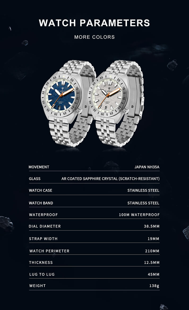 Kích thước vỏ (Dài × Rộng × Cao) 49 × 41 × 8.5 mm Trọng lượng 70 g Vật liệu vỏ / gờ: Thép không gỉ Dây đeo dạng lưới bằng thép không gỉ Vỏ