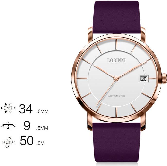 Nhãn hiệu LOBINNI Mã sản phẩm No.2065-1 Giới tính Nữ Kiểu máy Automatic (Máy Cơ) Đường kính mặt 36 mm Độ dày 9,7 mm Chất liệu vỏ Thép không gỉ 316L Chất liệu dây Dây da cao cấp Chất liệu mặt kính Mineral Crystal