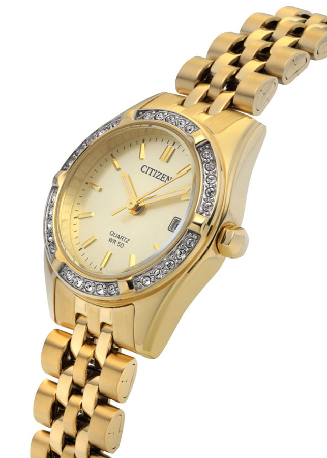 Đồng hồ QC07J204Y với thiết kế mặt đính đá xung quanh viền trong mặt đồng hồ làm nổi bật sự sang trọng và thời trang của sản phẩm Thông số kỹ thuật: - Dây :