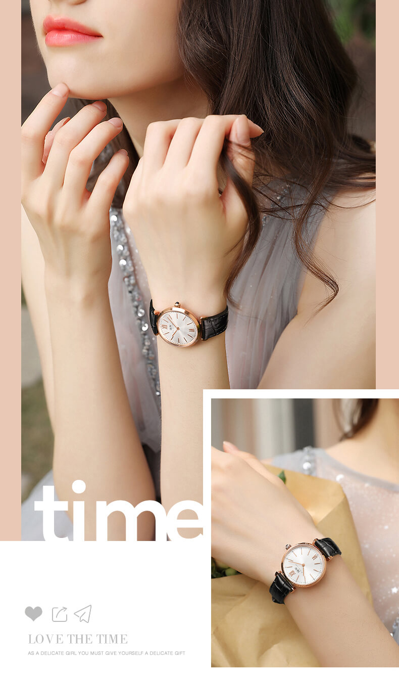 Dây da thật bền bỉ, thoáng mát khi sử dụng, đồng thời ôm trọn cổ tay thanh mảnh của nàng.
