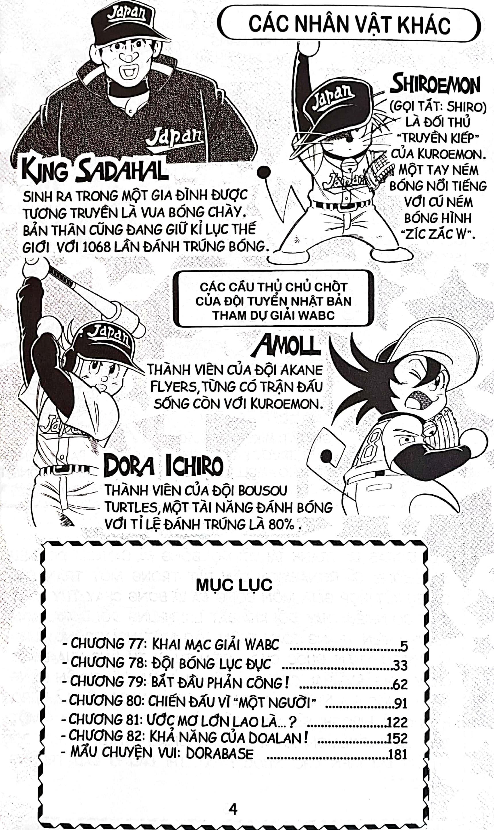 Mua tại TiktokDoraemon Bóng Chày - Truyền Kì Về Bóng Chày Siêu Cấp - Tập 13 Vậy là giải đấu WABC đã bắt đầu! Kuroemon được mời là cầu thủ chính thức trong đội tuyển quốc gia Nhật Bản dưới sự dẫn dắt của huấn luyện viên King Sadahal. Đội tuyển Nhật Bản tham dự WABC lần này được coi là đội tuyển khá mạnh với sự góp mặt của các anh tài như: Shiroemon, Dora Ichiro và cả Hiroshi. Cố len, đội tuyển Nhật Bản!!