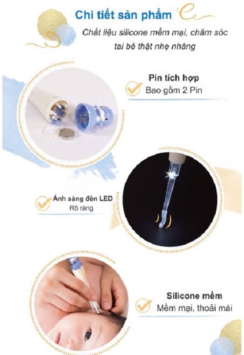 - Trang bị đèn led với ánh sáng dịu nhẹ, giúp mẹ nhìn rõ bụi bẩn trong tai, bảo vệ ống tai khỏi tổn thương khi không nhìn rõ. - Thiết kế nhỏ gọn, tiện
