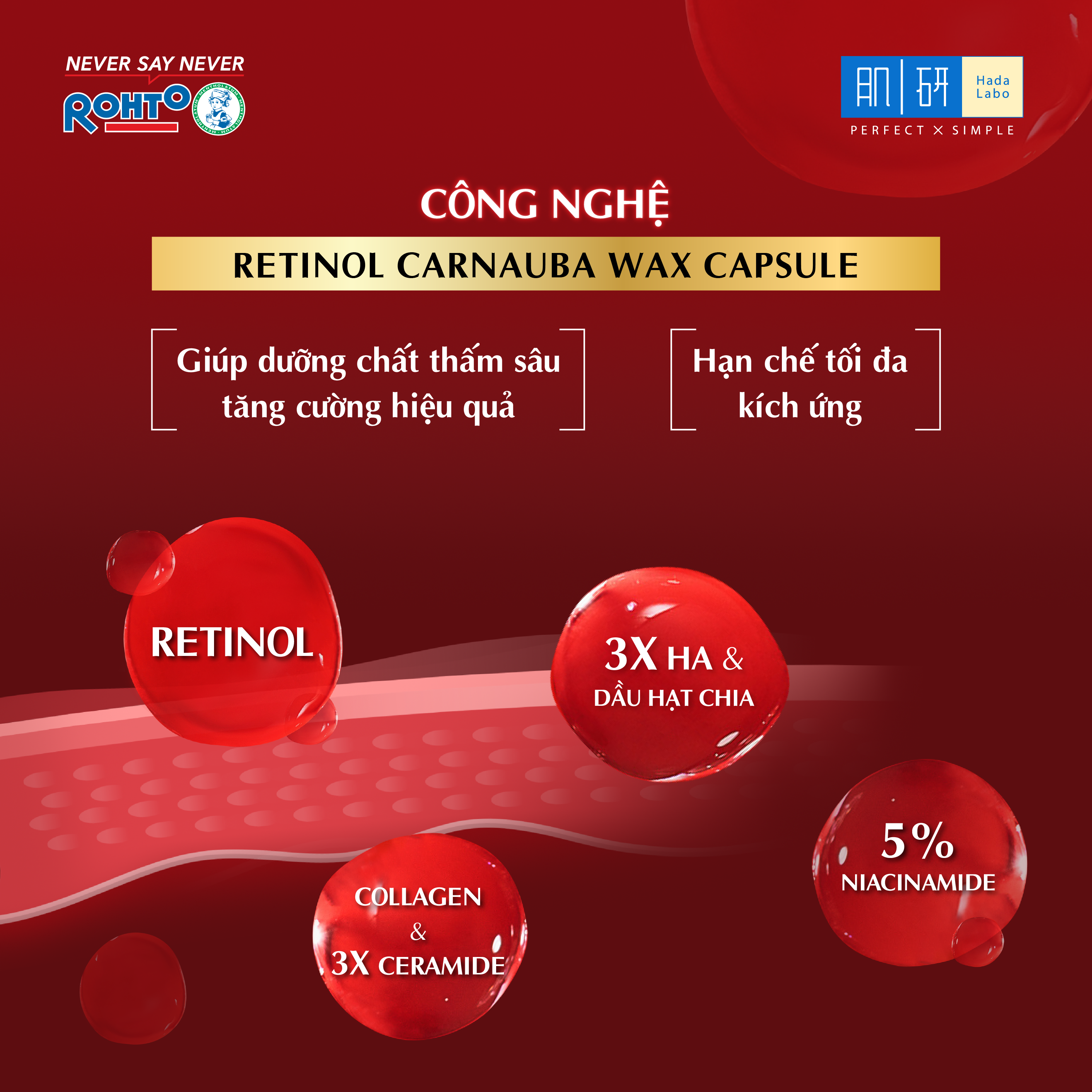 - Công nghệ Retinol Carnauba Wax Capsule giúp dưỡng chất thấm sâu, hạn chế tối đa kích ứng