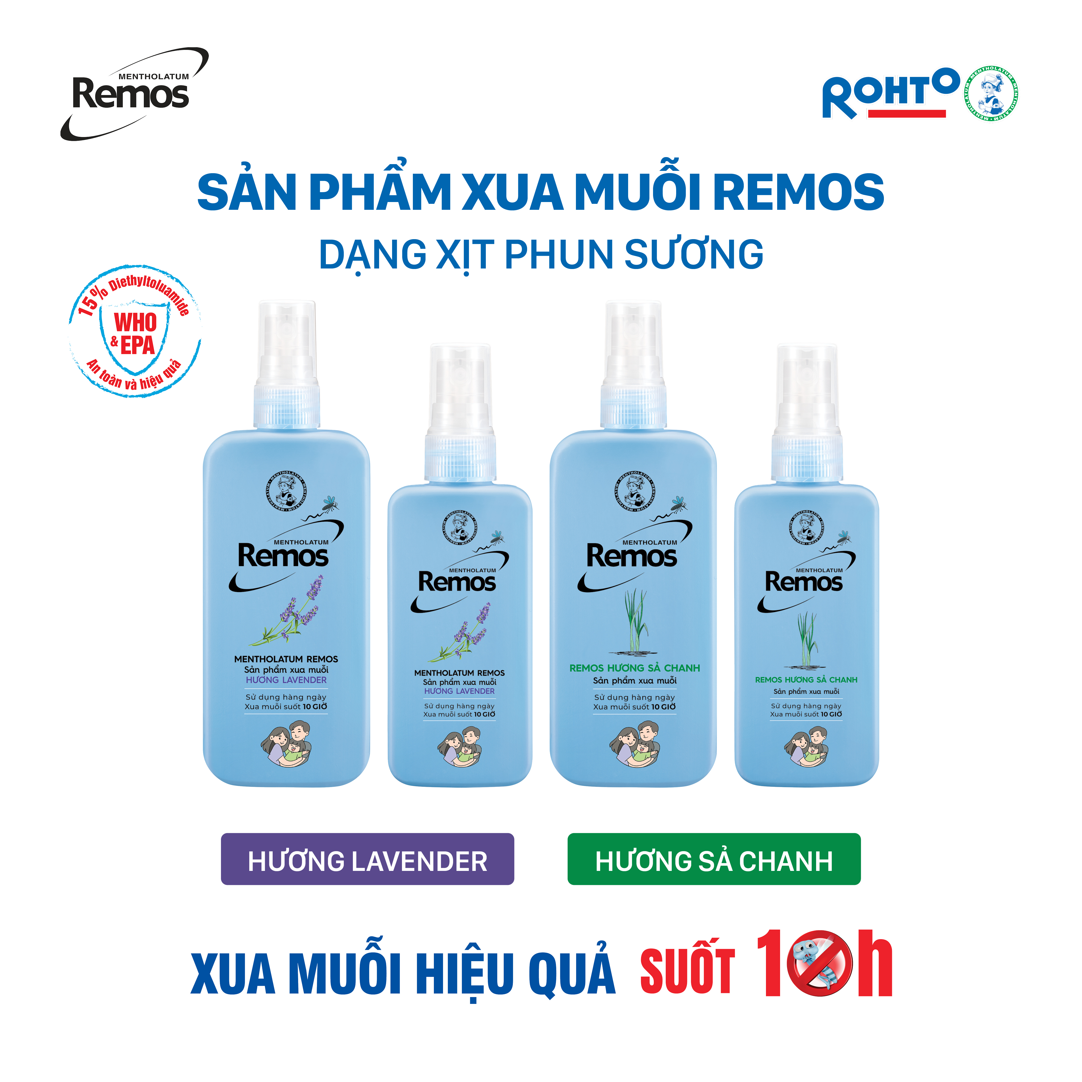 - Xịt chống muỗi Rohto Mentholatum Remos chứa Diethyltoluamide 15% giúp xua muỗi hiệu quả suốt 10 giờ. Hoạt chất này đã được WHO và EPA chứng nhận hiệu quả và tính an toàn trong việc xua muỗi.