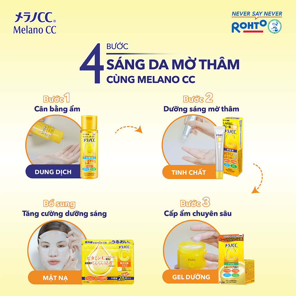- Nên dùng kết hợp dung dịch dưỡng trắng da Melano CC với các sản phẩm khác trong dòng Melano CC để nhận được hiệu quả tối đa. Gợi ý cách kết hợp như sau: