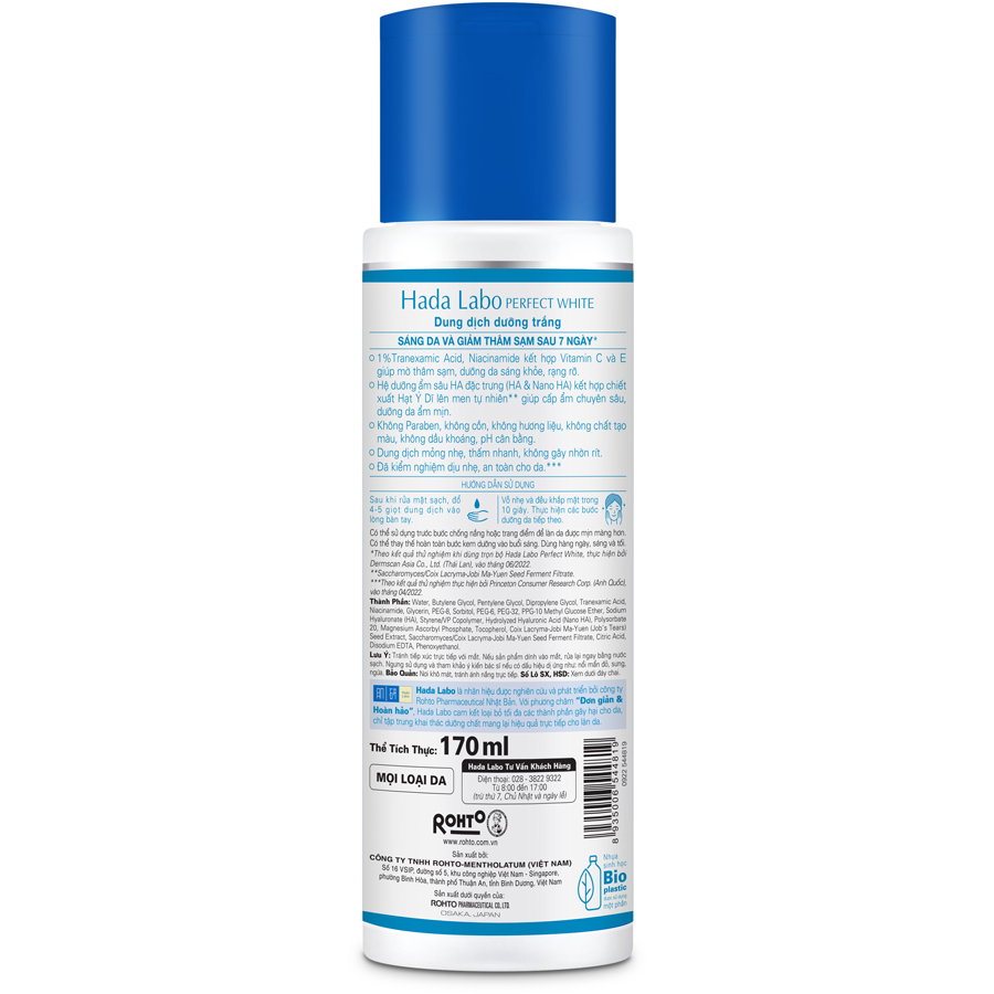 - Nên dùng kết hợp dung dịch dưỡng trắng Hada Labo với bộ sản phẩm Perfect White Tranexamic Acid để đạt hiệu quả tối ưu. Đối tượng sử dụng: Dành cho mọi loại da Thông tin thương hiệu: