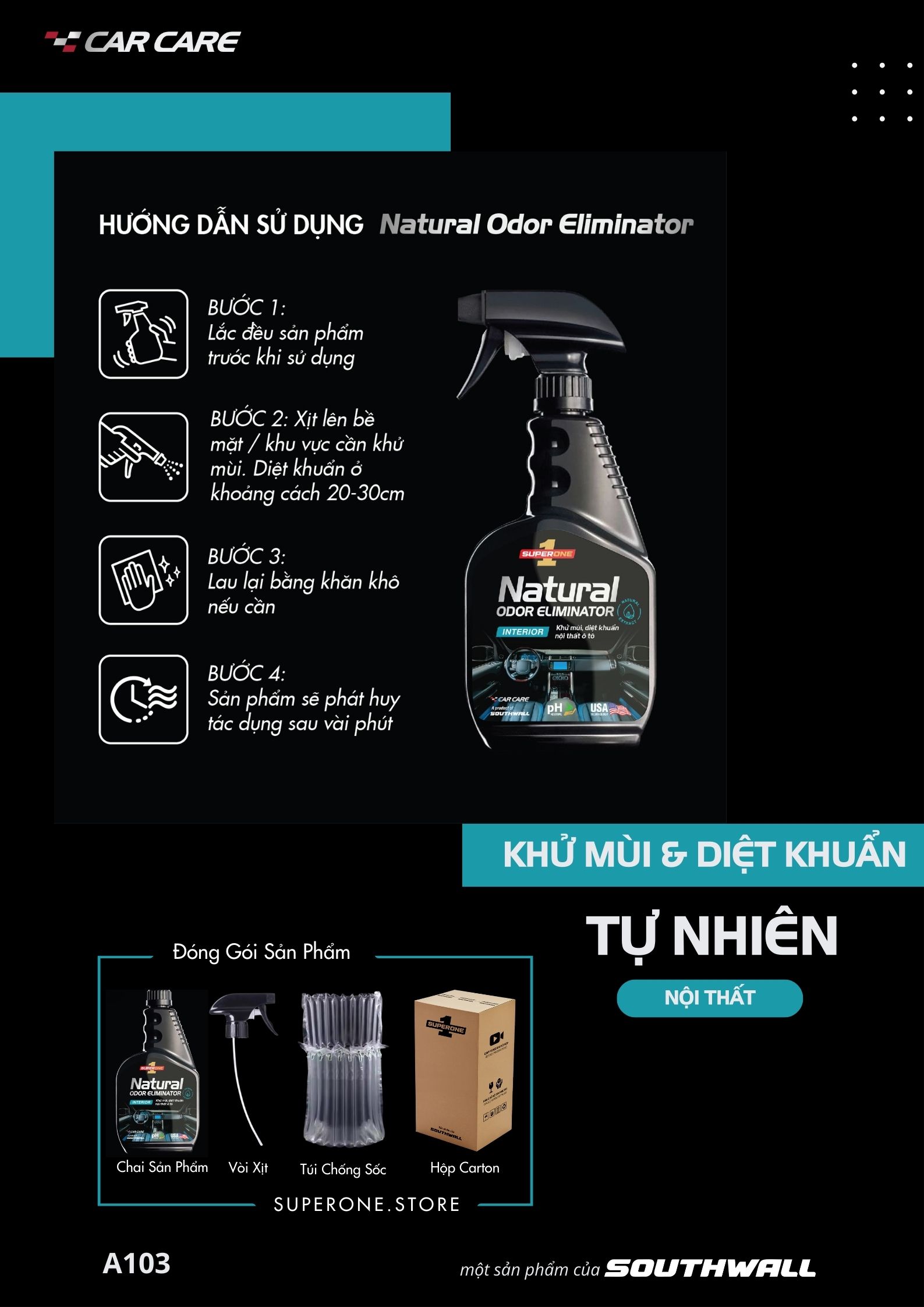 Dung Dịch Khử Mùi Diệt Khuẩn Super One Natural Odor Eliminator – Interior, một giải pháp tiên tiến cho việc chăm sóc ô tô. Công thức tiên tiến này hiệu quả loại bỏ các mùi khó chịu như mùi thuốc l.á, thú vật, thức ăn, mồ hôi và các mùi khác. Đồng thời, nó tiêu diệt và ngăn ngừa sự phát triển của nấm mốc và vi khuẩn, đảm bảo môi trường sạch sẽ và vệ sinh. Sản phẩm tự nhiên này chứa các thành phần hoạt chất chiết xuất từ thực vật, không chứa các hợp chất hại cho sức khỏe của bạn. Không giới hạn chỉ trong ô tô, nó cũng có thể được sử dụng để làm sạch không gian khác như nhà bếp, nhà vệ sinh, tủ quần áo và nhiều nơi khác.