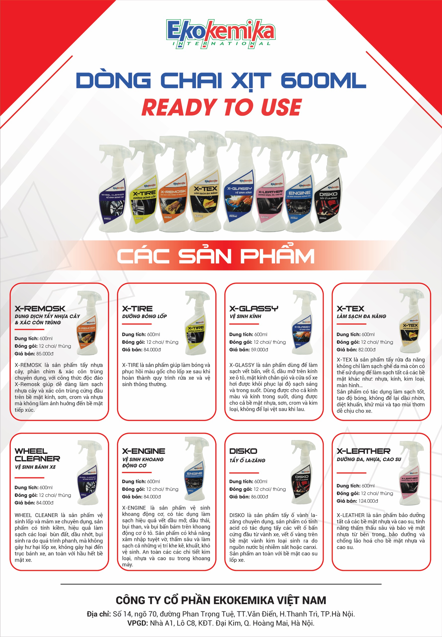 - Dễ Dàng Sử Dụng Với thiết kế chai tiện lợi và cách sử dụng đơn giản, việc áp dụng dung dịch làm sạch lốp X của Ekokemika trở nên dễ dàng và nhanh chóng. Chỉ cần phun một lượng nhỏ dung dịch lên bề mặt lốp, sau đó lau sạch bằng một khăn sạch, bạn sẽ thấy kết quả ngay tức thì.