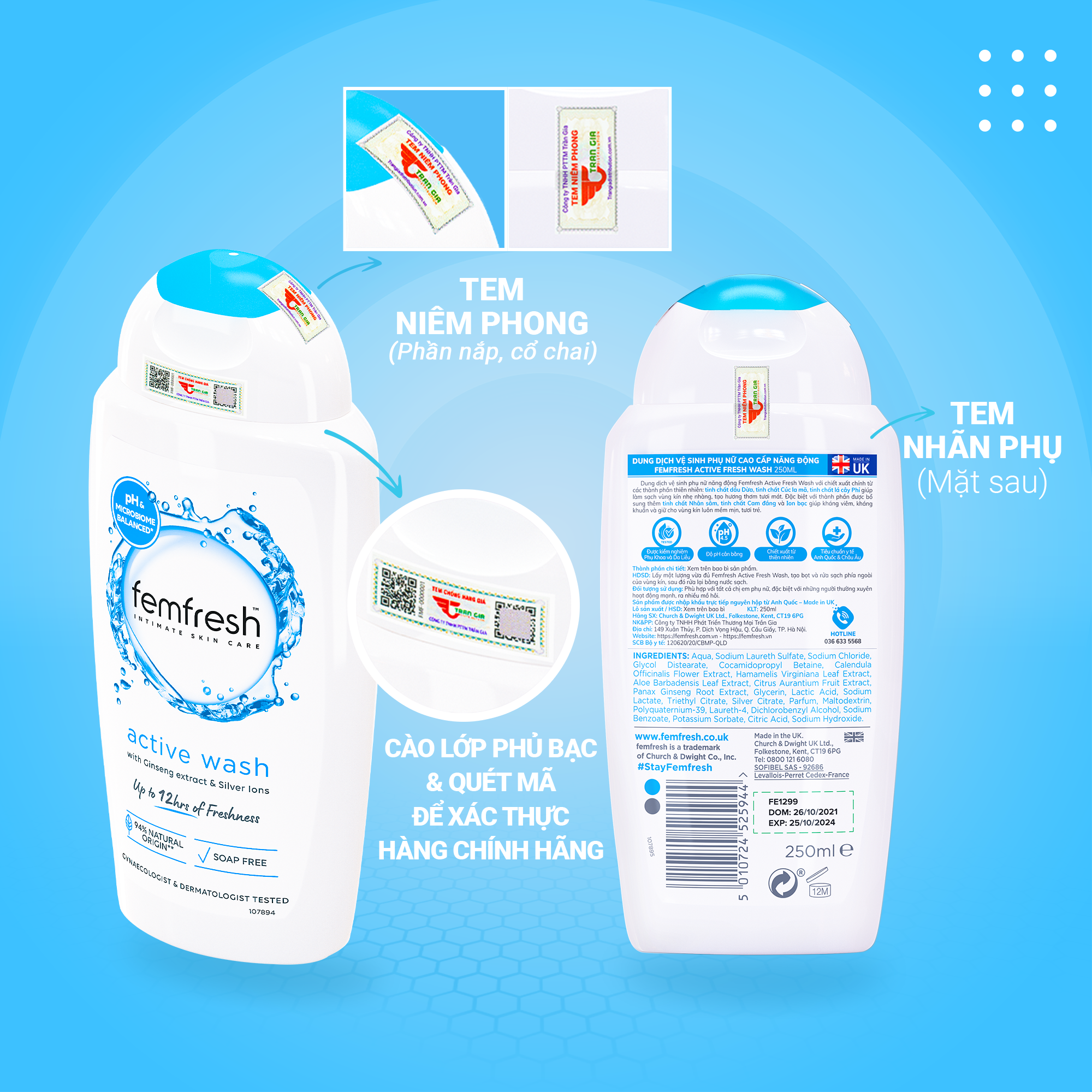 Mua tại TiktokDung dịch vệ sinh cho cả nữ và nam Femfresh Anh giúp làm sạch sẽ, thơm mát, ngăn ngừa viêm, ngứa, nấm phụ khoa - OZ Slim Store 1.Giới thiệu dung dịch vệ sinh cho cả nữ và nam Femfresh Anh - Phân Loại: Dung dịch vệ sinh cho cả nữ và nam - Thương hiệu: Femfresh - Xuất xứ: Anh - Đóng gói: có 8 phân loại: Loại dung dịch: + Soothing Wash: 250ml - Rửa nhẹ nhàng + Daily Feminine Wash: 150ml - Rửa hàng ngày + Daily wash: 250ml - Rửa hàng ngày + Pure & Fresh Wash: 250ml - Rửa sạch t & tươi mát + Active Wash: 250ml - Rửa sạch cho người năng động + Sensitive Wash: 250ml - Rửa sạch cho da nhạy cảm Loại xịt: + Xịt Active Deodorant: 125ml - Khử mùi cho người năng động + Xịt Daily Deodorant: 125ml - Khử mùi hàng ngày - Femfresh là thương hiệu thuộc Top đầu UK và Châu Âu về chăm sóc vùng kín phụ nữ, đã có mặt hơn 40 quốc gia trên thế giới. - Hỗ trợ kháng viêm, kháng khuẩn, chống ô xi hóa, trẻ hóa và thơm mát, dịu nhẹ cho vùng kín, từ thành phần thảo dược thiên nhiên quý hiếm tinh chất Cúc la mã, tinh chất Lô hội, tinh chất Nhân sâm, tinh chất Cúc thỷ xa, tinh chất quả Nam việt quất, tinh chất lá Tre ngà ... - Hỗ trợ giúp vùng kín luôn sạch sẽ, thơm mát. Đặc biệt với công thức bổ sung lợi khuẩn Lactobacillus giúp hỗ trợ ngăn ngừa viêm ngứa, nấm da hiệu quả cho phụ nữ thêm hạnh phúc, tự tin. - Sản phẩm được kiểm nghiệm phụ khoa (gynaecologically tested) và kiểm nghiệm da liễu (dermatologically tested), in rõ trên bao bì mặt trước của sản phẩm được thực hiện bởi EVIC France (EVIC France là một trong những tập đoàn Top đầu ở Châu Âu trong lĩnh vực thử nghiệm lâm sàng, thử, kiểm tra vi sinh, dược phẩm, mỹ phẩm…) Bao bì mẫu mã thay đổi theo từng đợt nhập hàng Soothing Wash: 250ml - Rửa nhẹ nhàng Bao bì mẫu mã thay đổi theo từng đợt nhập hàng Daily Feminine Wash: 150ml - Rửa hàng ngày Bao bì mẫu mã thay đổi theo từng đợt nhập hàng Daily wash: 250ml - Rửa hàng ngày Bao bì mẫu mã thay đổi theo từng đợt nhập hàng Pure & Fresh Wash: 250ml - Rửa sạch t & tươi mát Bao bì mẫu mã thay đổi theo từng đợt nhập hàng Active Wash: 250ml - Rửa sạch cho người năng động Bao bì mẫu mã thay đổi theo từng đợt nhập hàng Sensitive Wash: 250ml - Rửa sạch cho da nhạy cảm Bao bì mẫu mã thay đổi theo từng đợt nhập hàng Xịt Active Deodorant: 125ml - Khử mùi cho người năng động Bao bì mẫu mã thay đổi theo từng đợt nhập hàng Xịt Daily Deodorant: 125ml - Khử mùi hàng ngày Bao bì mẫu mã thay đổi theo từng đợt nhập hàng Bao bì mẫu mã thay đổi theo từng đợt nhập hàng Bao bì mẫu mã thay đổi theo từng đợt nhập hàng 2.Công dụng dung dịch vệ sinh cho cả nữ và nam Femfresh Anh Loại dung dịch: - Vệ sinh vùng kín hằng ngày giúp làm sạch, khử mùi hôi, làm thơm và mang lại cảm giác khô thoáng. - Duy trì độ ẩm tự nhiên và sự mềm mại cho bề mặt da. - Ngăn ngừa, làm sạch vi khuẩn gây viêm nhiễm, nấm ngứa. - Hỗ trợ giảm các vấn đề phụ khoa: v.iêm â.m đạo, h.uyết trắng, v.iêm â.m hộ, nấm, ngứa â.m hộ nhờ kháng v.iêm, kh.áng khuẩn từ các thành phần tự nhiên. - Hương thơm tự nhiên dịu nhẹ, an toàn, không gây kích ứng da. - Độ pH cân bằng, lý tưởng cho v.ùng k.ín nhờ thành phần thiên nhiên, Acid Lactic, Glycerin. - Tăng cường dưỡng chất giữ ẩm, chất chống ô xy hóa hỗ trợ giúp vùng kín luôn mềm mịn, tươi trẻ. - Sản phẩm được khuyến khích dùng cho cả nam và nữ vệ sinh sau khi qh - Sản phẩm đặc biệt phù hợp với những cô nàng có làn da cực kì nhạy cảm. Loại xịt: - Sản phẩm hỗ trợ làm thơm vùng kín, mang lại hương thơm dịu nhẹ, cảm giác sạch sẽ, thông thoáng, sảng khoái hàng ngày, đặc biệt trong chu kỳ kinh nguyệt. - Bảo vệ vùng kín khô thoáng, thơm mát suốt 12h. 3.Thành phần dung dịch vệ sinh cho cả nữ và nam Femfresh Anh Loại dung dịch: - Soothing Wash: 250ml Thành phần chi tiết: Aqua, Sodium Laureth Sulfate, Sodium Chloride (muối biển tinh khiết), Glycol Distearate, Cocamidopropyl Betaine (dầu dừa), Triethyl Citrate, Parfum, Laureth-4 (Giữ ẩm làm sạch), Glycerin (tự nhiên giữ ẩm), Polyquaternium-39, Dichlorobenzyl Alcohol C, Calendula Officinalis Flower Extract (tinh chất hoa Cúc la mã), Alpha-Glucan Oligosaccharide((Prebiotics lên men từ đường tự nhiên), Lonicera Japonica Flower Extract (tinh chất Kim ngân hoa), Bromo-2-Nitropropane-1,3-Diol (chống vi trùng), Polymnia Sonchifolia Root Juice (nước củ sâm Yacón trên núi Andes), Butylene Glycol (giữ ẩm), Maltodextrin, Vaccinium Macrocarpon Fruit Extract (tinh chất quả Nam việt quất – Chống oxi hóa và trị nhiễm trùng đường tiết niệu), Cantaurea Cyanus Flower Extract (tinh chất hoa Thỷ xa), Sodium Benzoate (muối), Lactic Acid, Sodium Lactate, Lactobacillus (lợi khuẩn Lactobacillus – lợi khuẩn đường sinh dục ), Sodium Hydroxide, Sodium Carbonate. - Daily wash:150ml, 250ml Thành phần chi tiết trên: Aqua, Sodium Laureth Sulfate, Sodium Chloride (muối), Cocamidopropyl Betaine (tinh chất dầu dừa), Calendula Officinalis Flower Extract (tinh chất hoa Cúc Kim Tiền), Aloe Barbadensis Extract (tinh chất Lô Hội), Glycerin, Lactic Acid, Sodium Lactate, Triethyl Citrate, Par