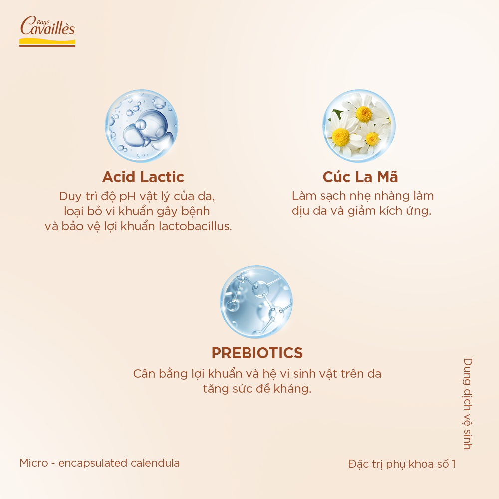 - Thành phần PREBIOTICS giúp cân bằng những lợi khuẩn và hệ vi sinh vật trên da, tăng sức đề kháng hạn chế sự tác động vi khuẩn gây bệnh ngoài da. 2/ Dung dịch vệ sinh phụ nữ Roge Cavailles Fraicheur chiết xuất từ tinh chất Bạc hà giúp làm sạch, cân bằng độ pH và tươi mát trong 12 giờ