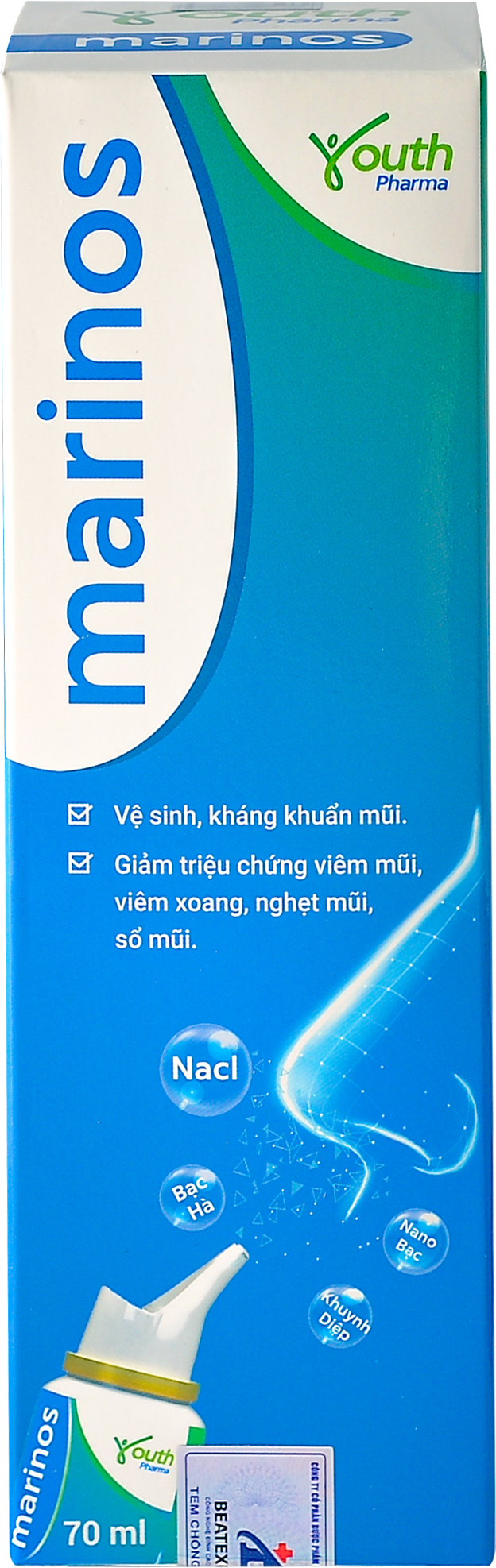 Xịt Mũi Marinos Youth Pharma 1. Công dụng: - Giúp mũi thông thoáng, dễ thở Hỗ trợ quá trình tái tạo niêm mạc mũi. - Ngăn ngừa vi khuẩn xâm nhập khoang mũi, giúp kháng