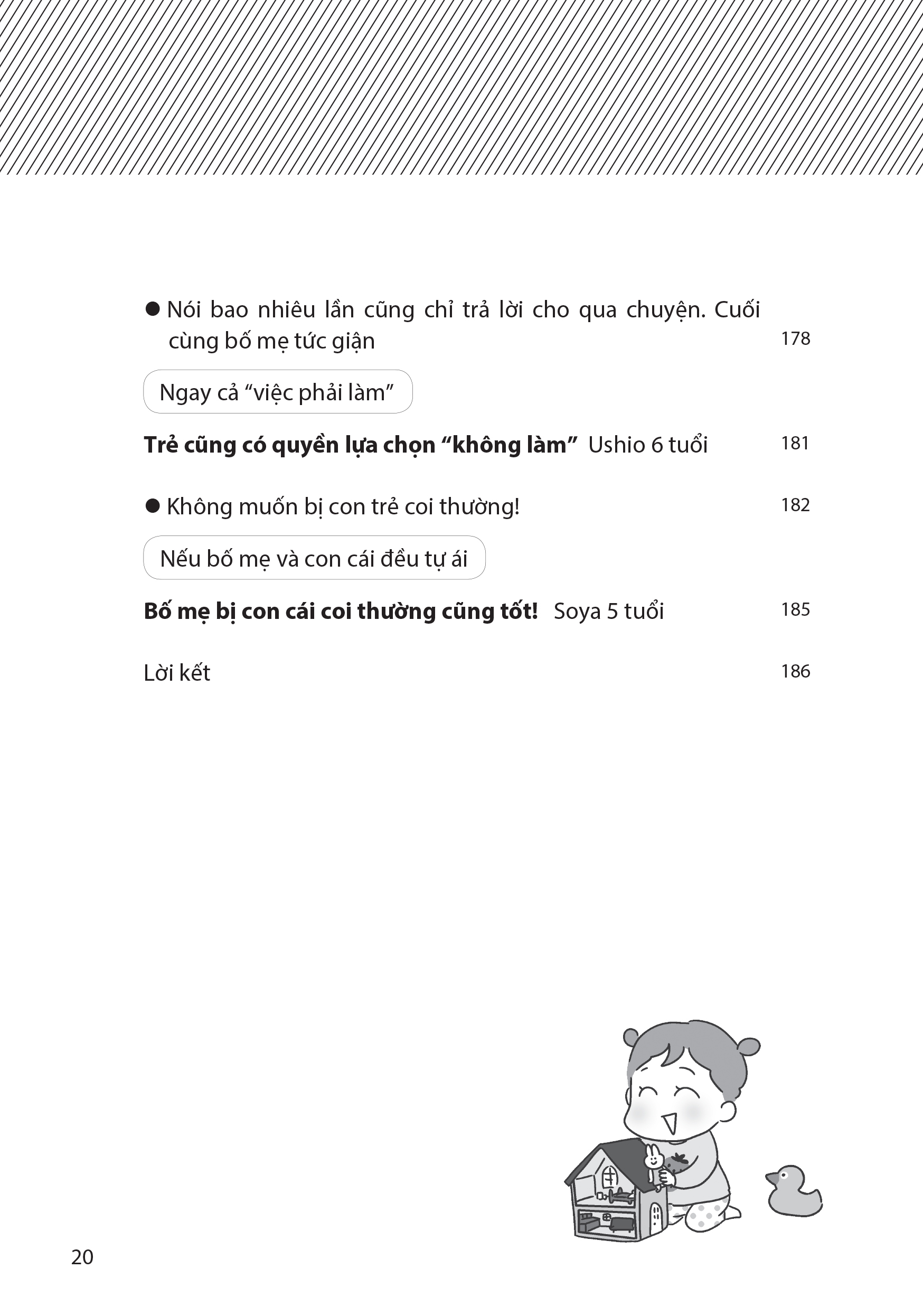 Bằng những kinh nghiệm của bản thân trong hơn 40 năm làm việc trong môi trường nuôi dạy trẻ, tác giả Shibata Aiko sẽ giúp các phụ huynh hiểu được rằng con trẻ có năng lực học tập, năng lực trưởng thành và sẽ tự mình tích lũy được nhiều điều trong quá trình trưởng thành. Nếu bố mẹ là người lớn thực thụ, con trẻ chắc chắn sẽ trở thành người lớn đúng nghĩa.