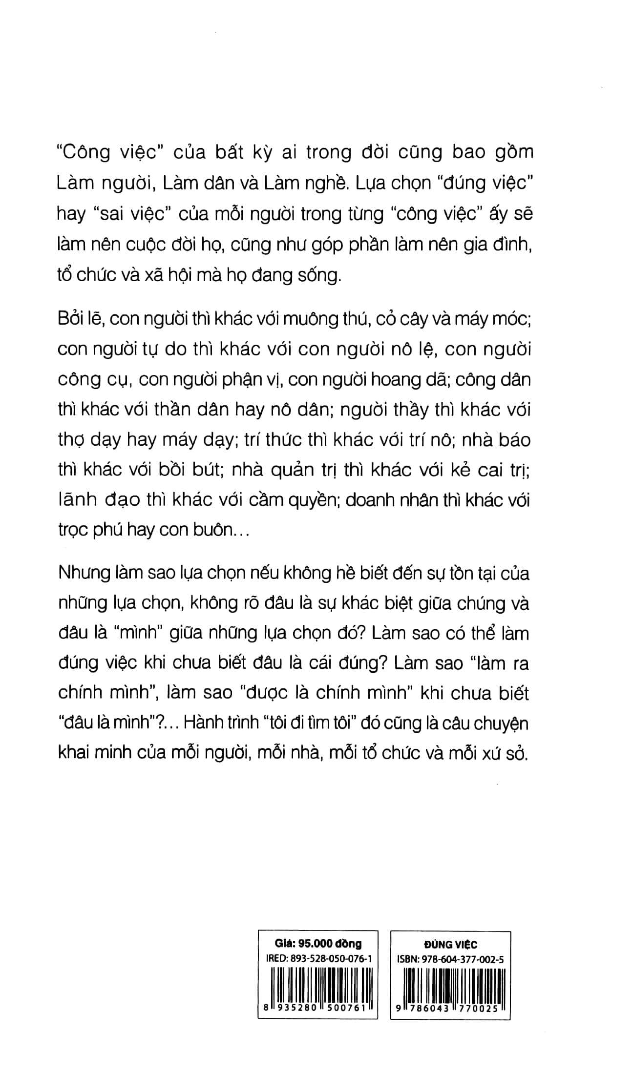 "Công việc" của bất kỳ ai trong đời cũng bao gồm “Làm người”, “Làm dân” và “Làm nghề”. Lựa chọn “đúng việc” hay “sai việc” của mỗi người trong từng "công việc" ấy sẽ làm nên cuộc đời họ, cũng như góp phần làm nên gia đình, tổ chức và xã hội mà họ đang sống.