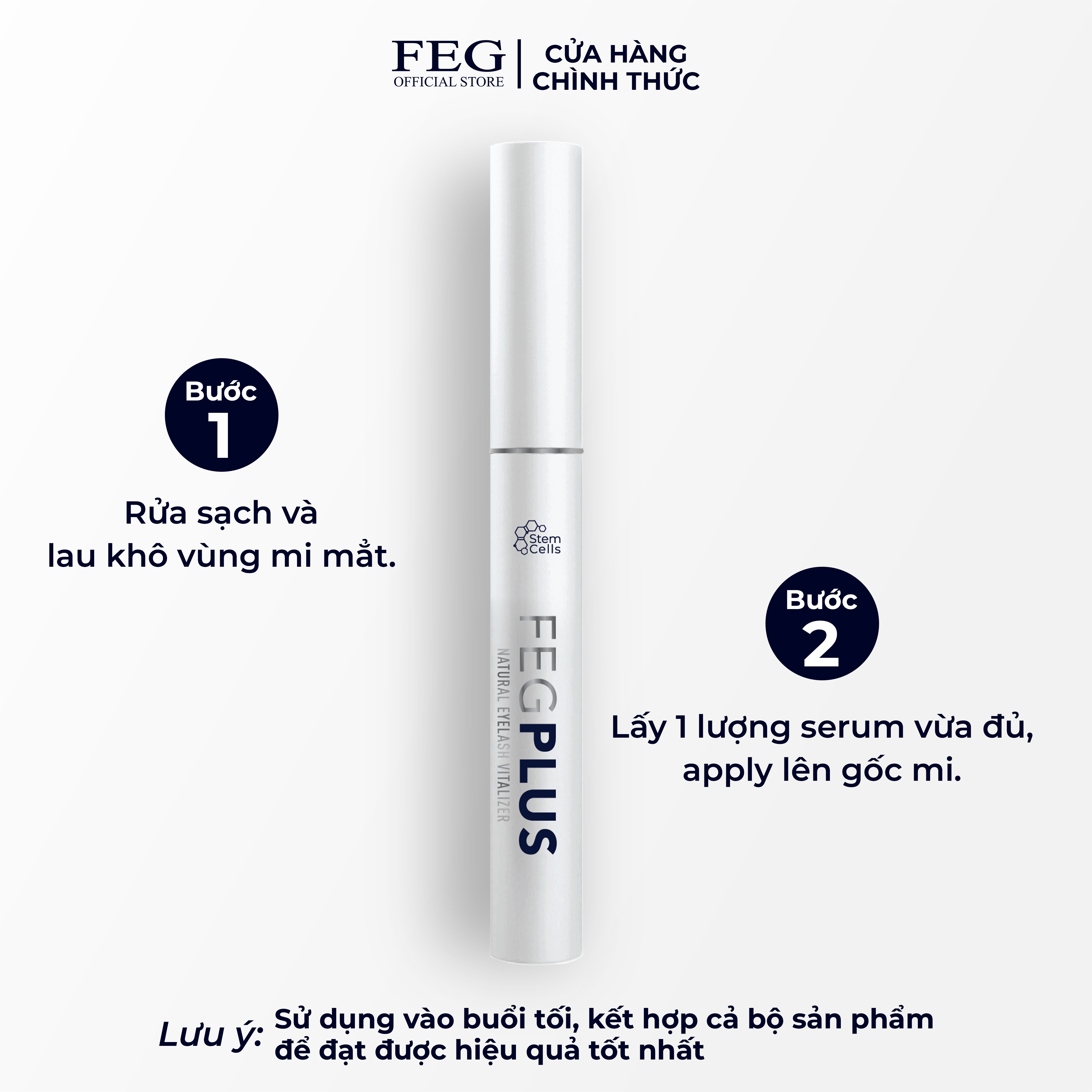 - Dùng FEG Plus Stem Cells vào buổi sáng Bước 1: Vệ sinh vùng mi mắt và lau khô trước khi sử dụng. Bước 2: Lấy một lượng serum vừa đủ và chuốt nhẹ lên gốc mi.