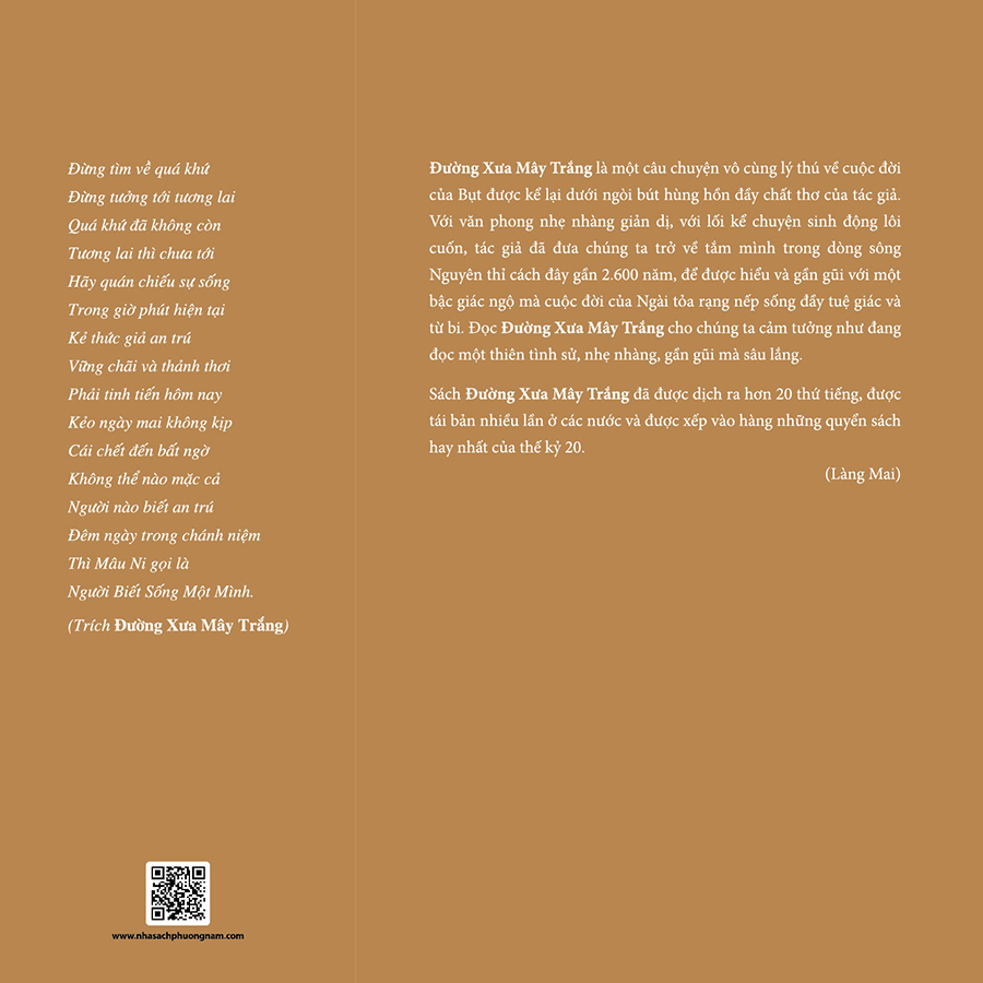 Đường Xưa Mây Trắng là một câu chuyện vô cùng lý thú về cuộc đời của Bụt được kể lại dưới ngòi bút hùng hồn đầy chất thơ của tác giả. Với văn phong nhẹ nhàng giản dị, với lối kể chuyện sinh động lôi cuốn, tác giả đã đưa chúng ta trở về tắm mình trong dòng sông Nguyên thỉ cách đây gần 2.600 năm, để được hiểu và gần gũi với một bậc giác ngộ mà cuộc đời của Ngài tỏa rạng nếp sống đầy tuệ giác và từ bi. Đọc Đường Xưa Mây Trắng cho chúng ta cảm tưởng như đang đọc một thiên tình sử, nhẹ nhàng, gần gũi mà sâu lắng.