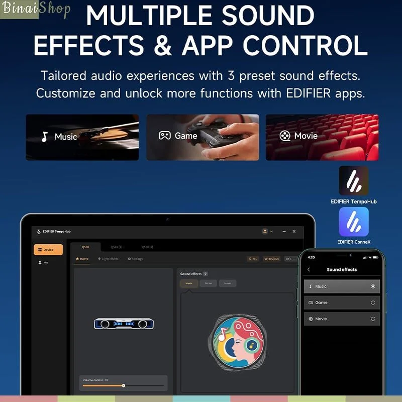 - Đắm chìm trong trải nghiệm âm thanh được thiết kế riêng với ba hiệu ứng âm thanh cài sẵn cho nghe nhạc, xem phim và chơi game.