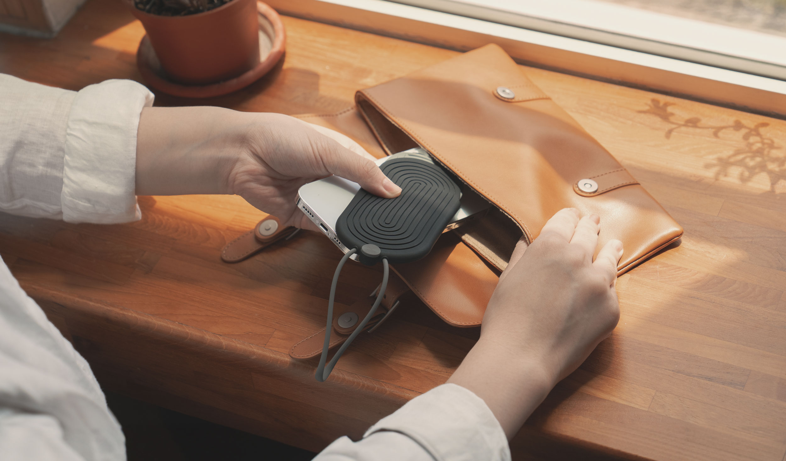 Thiết kế tối giản với đường cắt góc bo tròn mềm mại ôm sát sản phẩm, lớp da bò thô bên trong giúp làm sạch bề mặt hộp đựng tai nghe và tạo cảm giác
