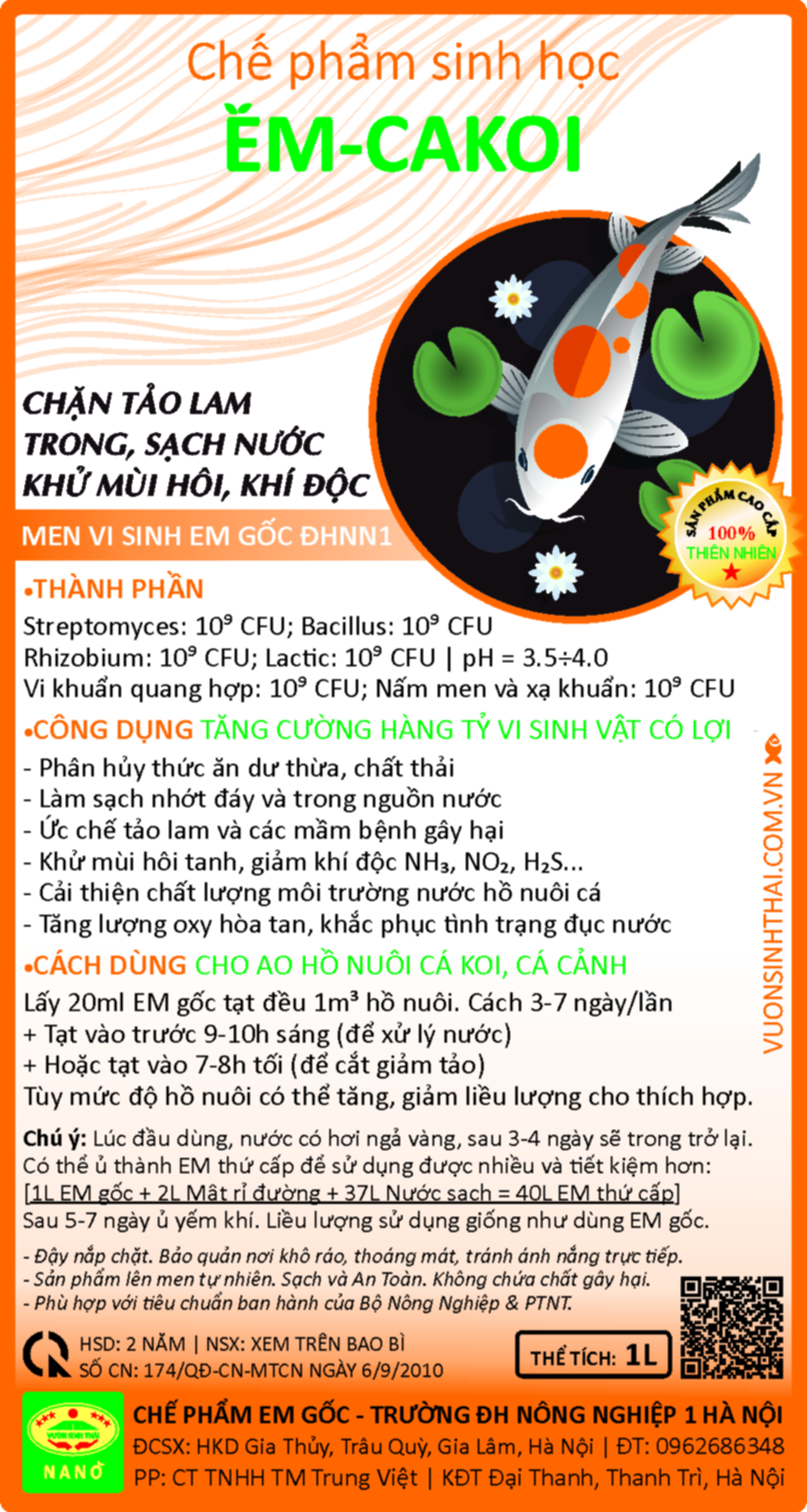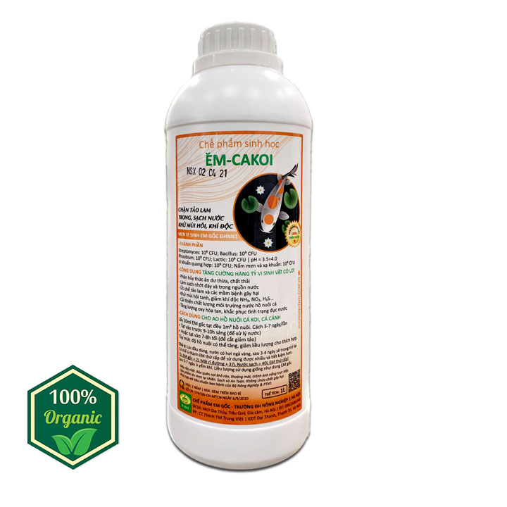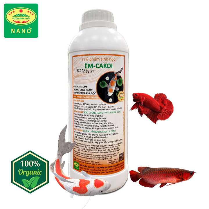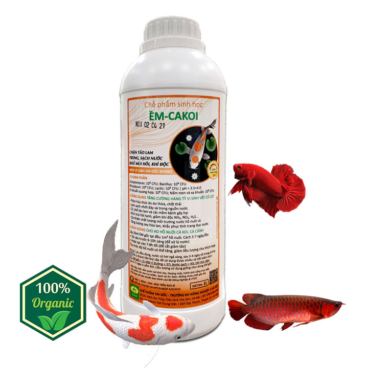 MEN VI SINH HỒ CÁ KOI, CÁ CẢNH EM-CAKOI Là dòng men vi sinh chuẩn gốc của Đại Học Nông Nghiệp 1 Hà Nội, với hàng tỷ vi sinh vật có lợi giúp cải thiện chất lượng nước hồ nuôi, ức chế tảo lam, khử khí độc, ngăn chặn các vi khuẩn gây bệnh, phân hủy các cặn bã dư thừa làm sạch nguồn nước … ⇒ LÀM TRONG SẠCH NGUỒN NƯỚC  ⇒ CHẶN TẢO LAM. KHỬ MÙI HÔI, KHÍ ĐỘC ⇒ ỨC CHẾ MẦM BỆNH GÂY HẠI EM-CAKOI Men vi sinh EM gốc của trường ĐHNN I Hà Nội  Dung tích: 1L | HSD: 2 năm kể từ ngày sản xuất Thành phần chính Streptomyces: 109 CFU; Rhizobium: 109 CFU; Lactic: 109 CFU; Bacillus: 109 CFU Vi khuẩn quang hợp: 109 CFU; Nấm men và xạ khuẩn: 109 CFU pH = 3.5÷4.0 | HSD: 2-3 năm Công dụng của Men vi sinh xử lý nước EM-CAKOI – Cung cấp hàng tỷ lợi khuẩn giúp cải thiện chất lượng môi trường ao nuôi Cá Koi – Phân hủy thức ăn dư thừa, chất thải của Cá Koi – Khử mùi hôi tanh. Sạch nhớt đáy và làm trong nguồn nước ao hồ nuôi – Tăng hàm lượng oxy trong nước, khắc phục tình trạng đục nước – Khử mùi hôi tanh khí độc NH3, H2S… – Ức chế tảo lam và các mầm bệnh gây hại. Giúp Cá Koi khỏe mạnh, ít bệnh tật Cách sử dụng men vi sinh cho hồ Cá Koi, Cá cảnh Lấy 20ml Men vi sinh EM gốc tạt đều 1m3 (1000 lít nước) hồ nuôi cá cảnh, cá Koi…