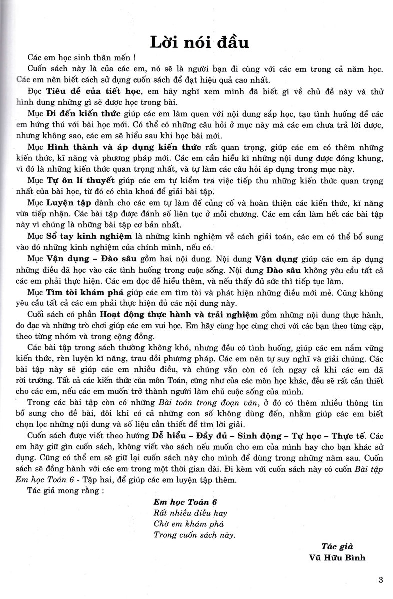 Các em nên dùng kèm 2 quyển Bài tập Em học Toán 6 với 2 quyển Em Học Toán 6 để luyện tập thêm các kĩ năng giải toán mà các em học được trong sách giáo khoa, từ đó củng cố và phát triển năng lực của bản thân để tự tin giải chính xác bất kì bài toán nào các em gặp ở các bài kiểm tra Toán 6.