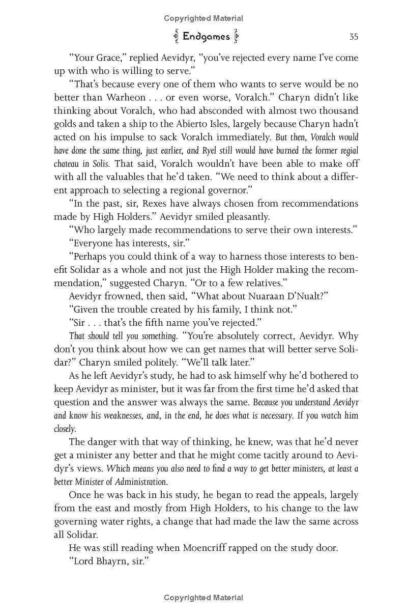 Solidar is in chaos. Charyn, the young and untested ruler of Solidar, has survived assassination, and he struggles to gain control of a realm in the grip of social upheaval, war, and rioting. Solidar cannot be allowed to slide into social and political turmoil that will leave the High Holders with their ancient power and privilege, and the common people with nothing. But the stakes are even higher than he realises.