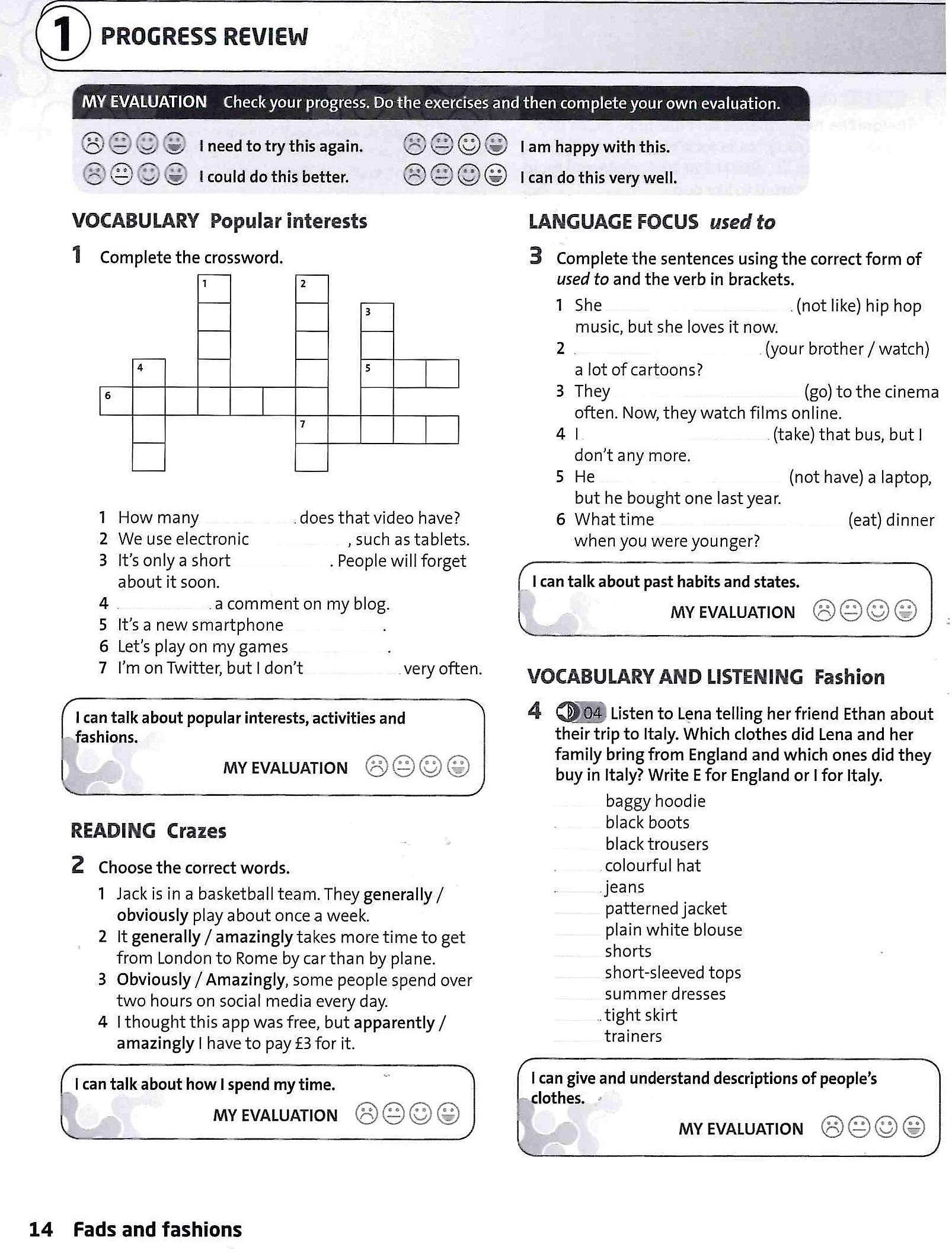 There is a two-page Progress review at the end of each unit. These exercises check understanding of all the vocabulary, grammar and skills presented in the unit. They also provide a record of what has been learned in the unit.