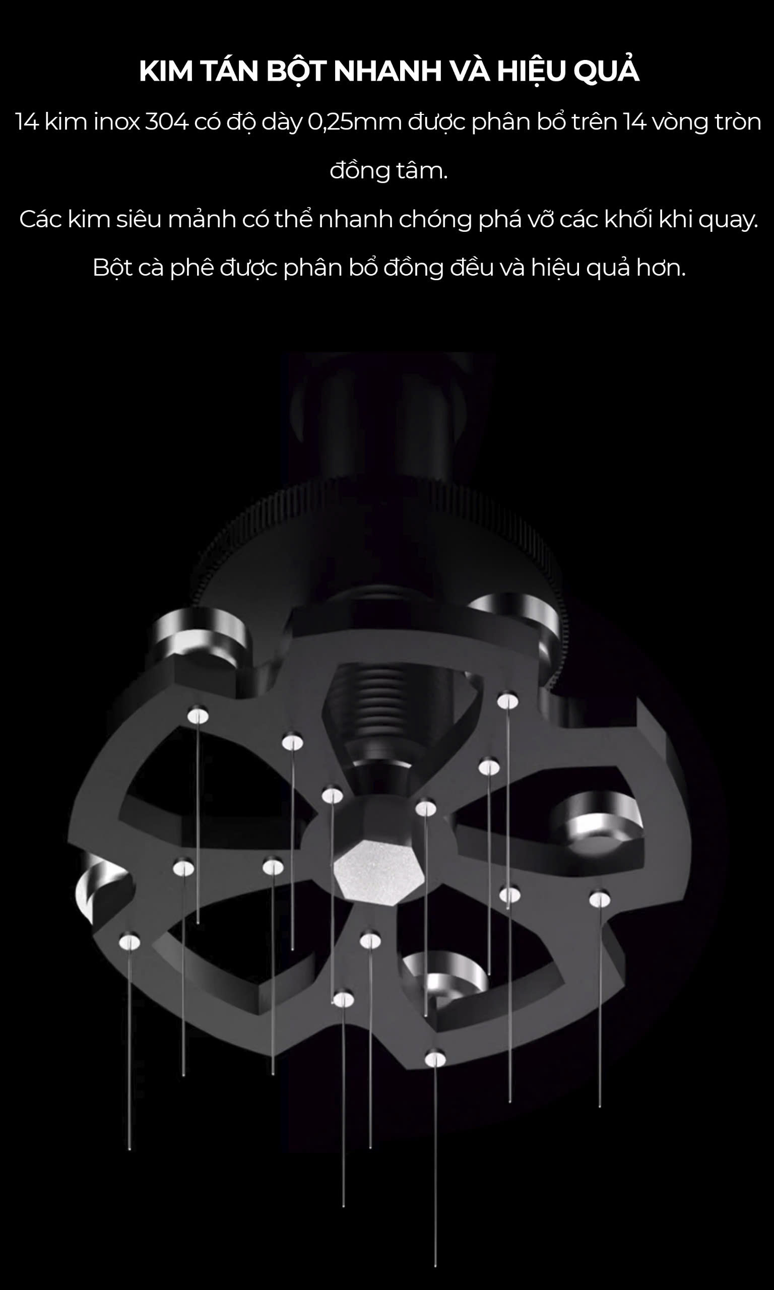 ƯU ĐIỂM NỔI BẬT CỦA SẢN PHẨM ️ Công nghệ xoắn ốc tự động xoay – Tán bột nhanh. Khi nhấn xuống, trục tự động xoay theo đường ren, giúp 14 kim phân phối bột đồng đều, tránh tình trạng bột vón cục. ️ Hệ thống 14 kim inox 304 siêu mảnh, dày 0,25mm sắp xếp theo 14 vòng tròn đồng tâm, giúp phân bổ bột tối ưu, hạn chế kênh rãnh (channeling). ️ Khoảng cách giữa các rãnh trộn: 2,2mm, phạm vi trộn tối đa: 55mm. ️ Điều chỉnh độ sâu kim linh hoạt (18 - 22mm). Xoay ngược chiều kim đồng hồ để tăng độ sâu, xoay cùng chiều để giảm. ️ Đế từ tính siêu chắc với 10 nam châm phân bổ đều, giúp cố định chắc chắn trên tay cầm 58mm, đảm bảo thao tác chính xác. ️ Thiết kế tích hợp – Không cần đế bảo quản. Kim tán được thu gọn bên trong, giúp bảo vệ sạch sẽ, không tiếp xúc với mặt bàn khi không sử dụng.