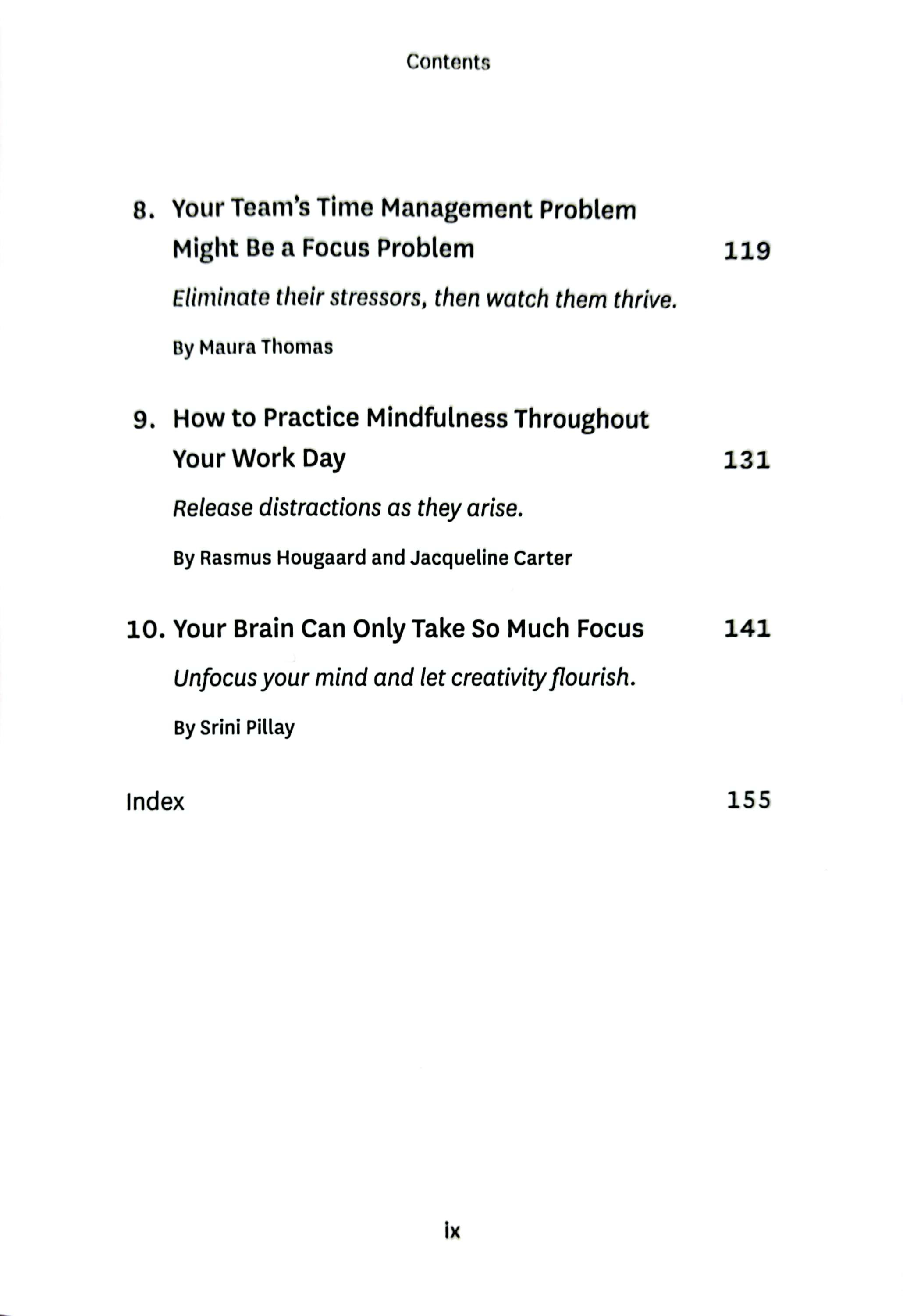 The importance of achieving focus goes well beyond your own productivity. Deep focus allows you to lead others successfully, find clarity amid uncertainty, and heighten your sense of professional fulfillment. Yet the forces that challenge sustained focus range from dinging phones to office politics to life's everyday worries. This book explains how to strengthen your ability to focus, manage your team's attention, and break the cycle of distraction. This volume includes the work of:
