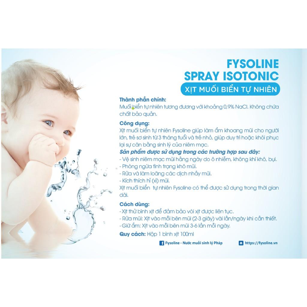 - 100% nước muối biển tự nhiên- Dạng xịt phun sương, êm dịu- Không chứa chất bảo quản- Dùng cho trẻ sơ sinh từ 3 tháng tuổi, trẻ em và người lớn I. Thành phần chính: Muối biển tự nhiên tương đương với khoảng 0,9% NaCl. Không chứa chất bảo quản. II. Công dụng: Xịt muối biển tự nhiên Fysoline giúp làm ẩm khoang mũi cho người lớn, trẻ sơ sinh từ 3 tháng tuổi và trẻ nhỏ, giúp duy trì hoặc khôi phục lại sự cân bằng sinh lý của niêm mạc. III. Sản phẩm được sử dụng trong các trường hợp sau đây: