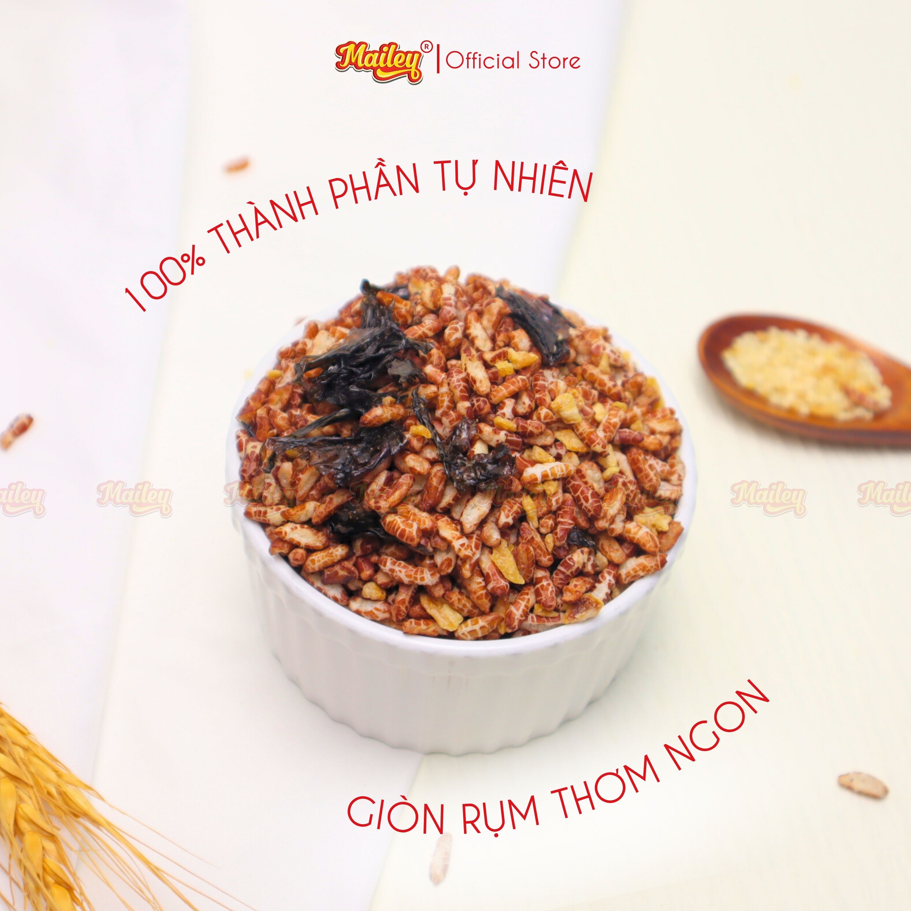 - Gạo lứt sấy được chế biến theo công thức độc đáo của Mailey, Từng hạt gạo giòn tan, thấm đều gia vị, hòa quyện với hương thơm của tỏi/rong biển, vị ngọt ngọt, mặn mặn, ăn cực cuốn