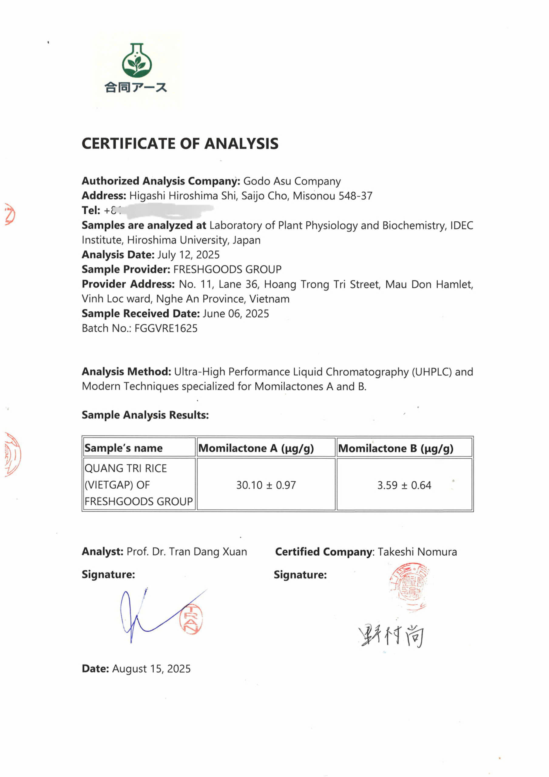 1. Gạo Quảng Trị (VIETGAP)của Freshgoods Group đặc biệt chứa hàm lượng cao hợp chất Momilactones A (MA) và Momilactones B (MB) (Xin vui lòng xem kết quả phân tích đính kèm). Theo nghiên cứu