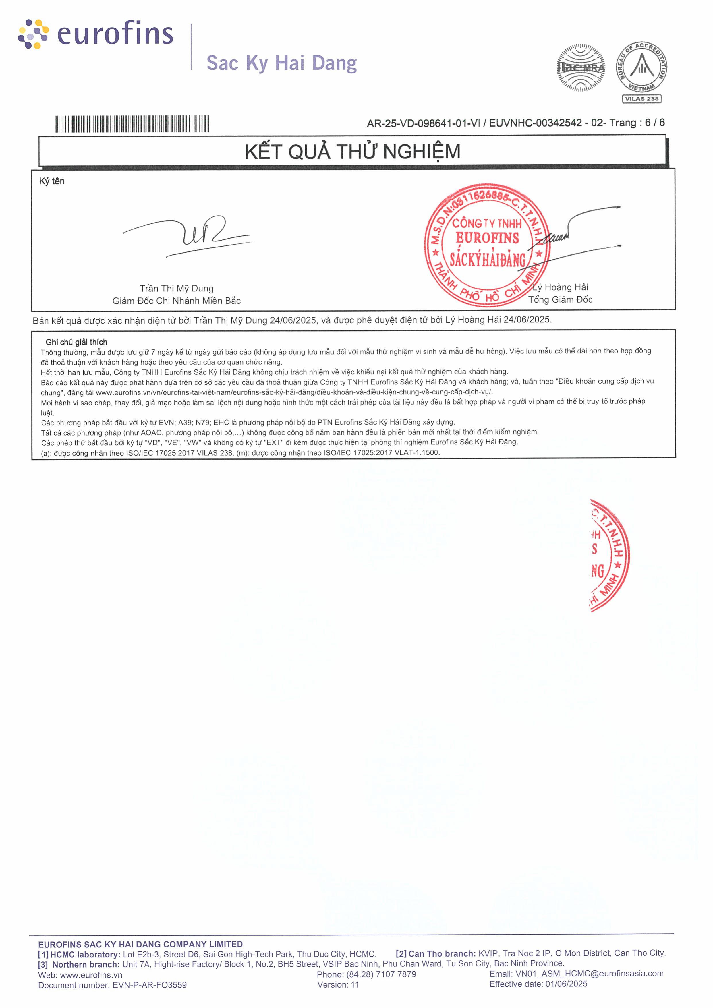- Đáp ứng các tiêu chuẩn về dư lượng thuốc bảo vệ thực vật, kim loại nặng và các chỉ tiêu an toàn thực phẩm khác của Liên minh Châu Âu (EU). (Kết quả thử nghiệm của Eurofin đính kèm)