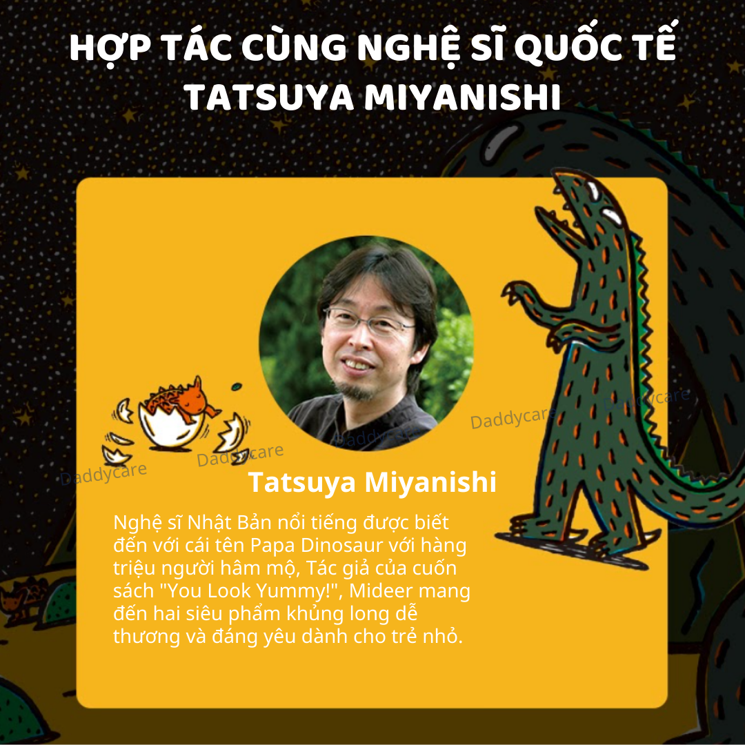 - HỢP TÁC CÙNG NGHỆ SĨ QUỐC TẾ TATSUYA MIYANISHI: Nghệ sĩ Nhật Bản nổi tiếng được biết đến với cái tên Papa Dinosaur với hàng triệu người hâm mộ Tatsuya Miyanishi: Tác giả của cuốn sách "You Look Yummy!", Mideer mang đến hai siêu phẩm khủng long dễ thương và đáng yêu dành cho trẻ nhỏ.