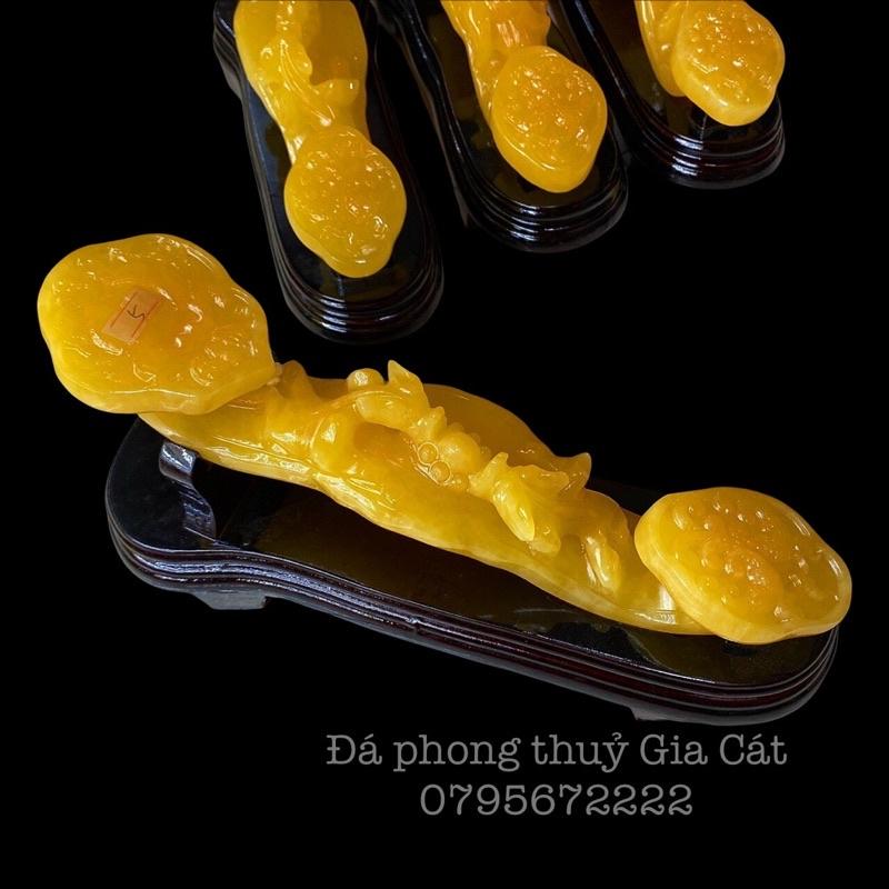 - Chất liệu đá ngọc hoàng long loại đẹp vàng ươm nguyên khối kèm đế gỗ