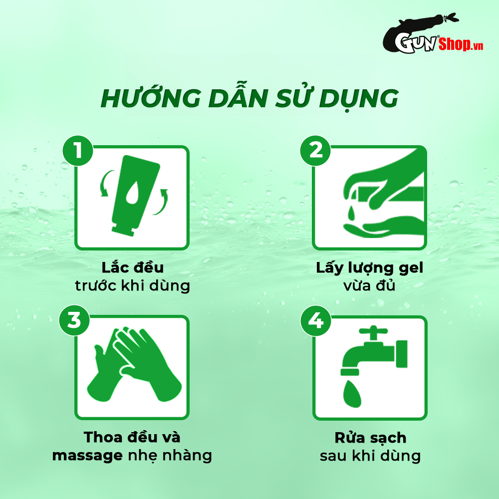 ✪ Cách dùng: Mở lọ ra rồi lấy một lượng sản phẩm vào trong lòng bàn tay theo nhu cầu. Đối với "cậu bé": Đổ gel vào trong lòng bàn tay rồi xoa đều lên cậu bé tạo chất trơn vừa đủ và massage một lúc Đối với "cô bé": Đổ một ít gel vào ngón tay rồi xoa lên "cô bé" đều bên ngoài và bên trong để tạo độ trơn ẩm ướt át.