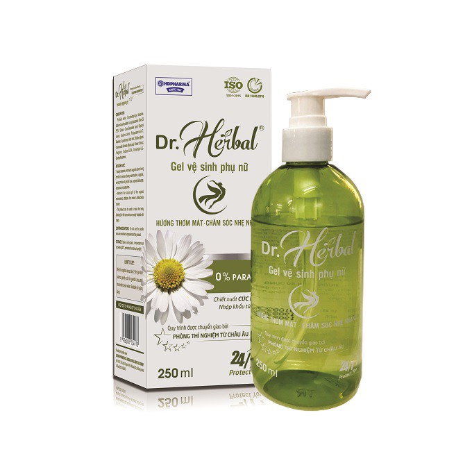 Gel vệ sinh phụ nữ Dr.Herbal - Hương thơm mát, chăm sóc dịu dàng được chị em tin chọn vì nhà sản xuất HDPHARMA cam kết thành phần không có Paraben (chất bảo quản hóa học); được chiết xuất từ Cúc La Mã nhập khẩu từ Pháp có tác dụng làm dịu các tổn thương da, giảm viêm, chống nhiễm khuẩn; quy trình sản xuất được chuyển giao từ phòng thí nghiệm châu Âu, theo chuẩn mực chất lượng cao nhất trên thế giới hiện nay là GMP EU.