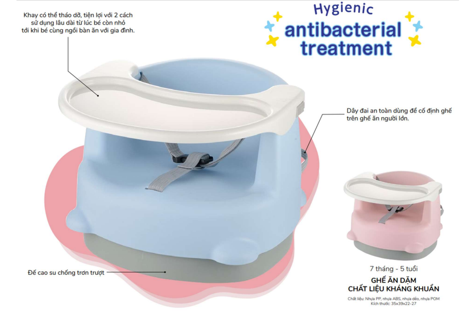 GHẾ ĂN DẶM RICHELL CHẤT LIỆU KHÁNG KHUẨN Chất liệu nhựa kháng khuẩn an toàn khi sử dung tiếp xúc với thực phẩm, thức ăn cho bé. Thành phần: Nhựa PP (nhựa số 5),