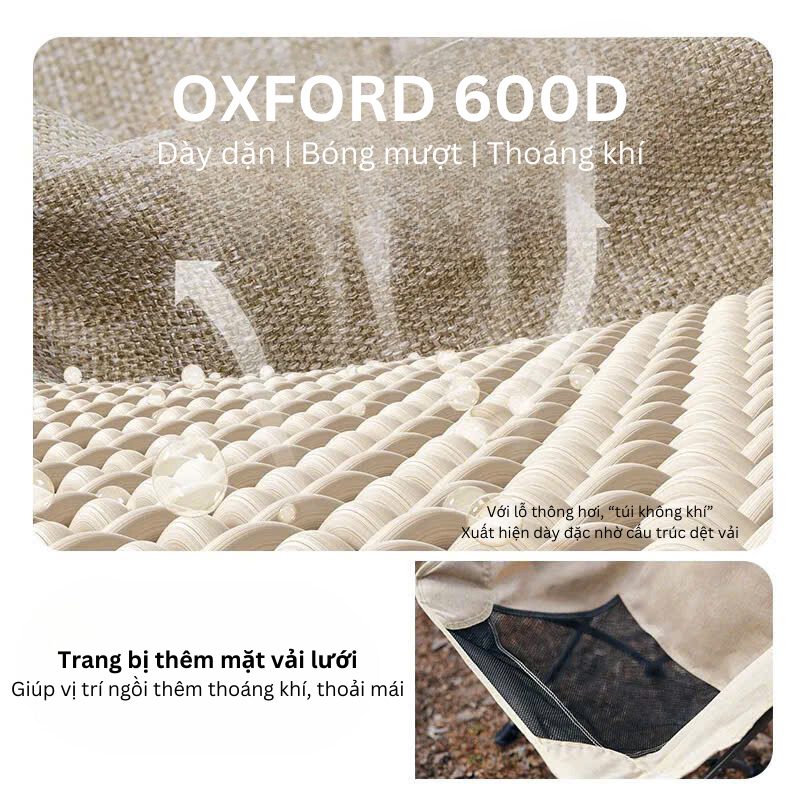 ------ Ghế Ngồi gập gọn được làm từ Chất liệu khung hợp kim nhôm sơn tĩnh điện siêu cứng, mặt ngồi bằng vải 600D Oxford cao cấp siêu êm. Khung hợp kim cứng giúp ghế