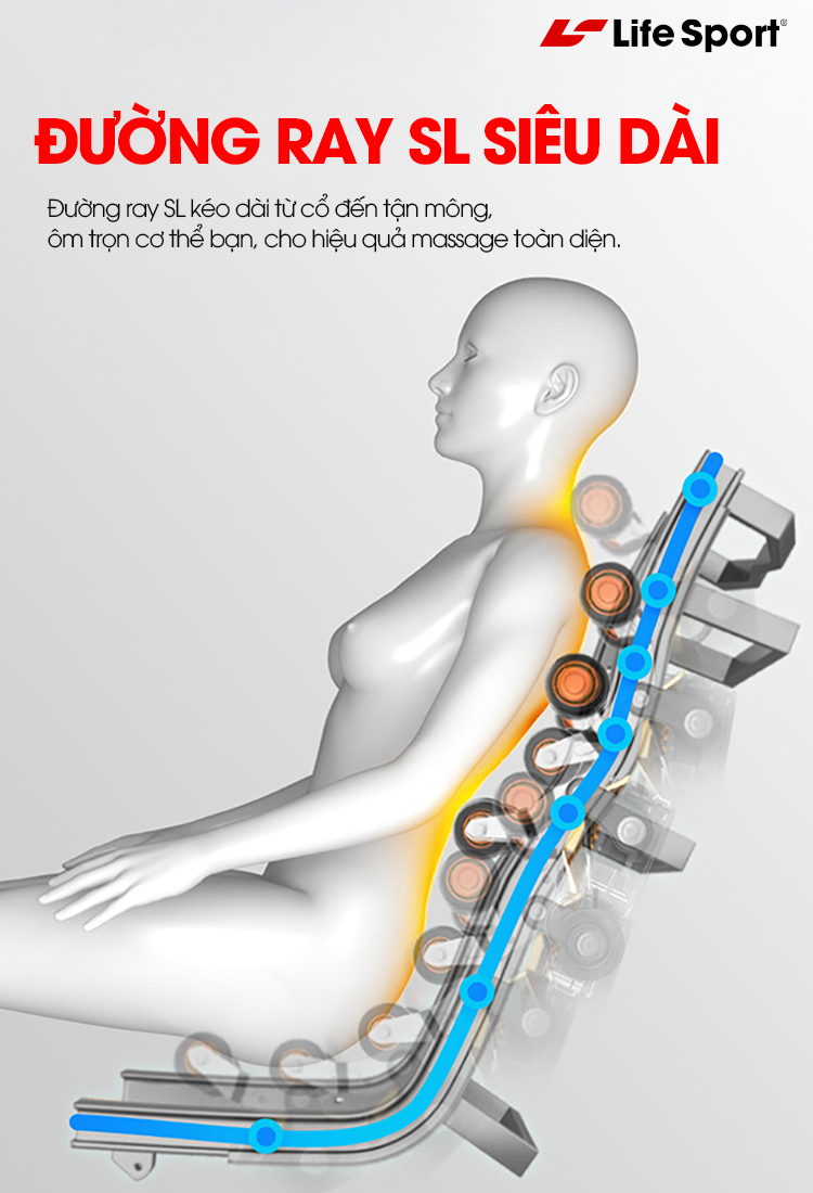 Đường ray SL kéo dài từ cổ đến tận mông, ôm trọn cơ thể bạn, cho hiệu quả massage toàn diện. Chức năng tự động dò quét huyệt đạo để massage đúng vào những điểm hay đau nhức của cơ thể cũng được tích hợp trong sản phẩm này.