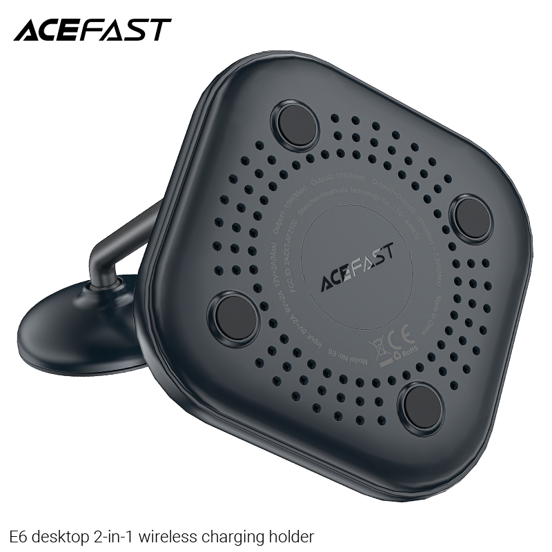 Mua tại Tiktok*Lưu ý: Đế sạc phù hợp với các thiết bị có hỗ trợ sạc không dây, riêng chức năng sạc mag.safe chỉ hỗ trợ cho các dòng từ i.phone 12 series trở lên và các dòng tai nghe có hỗ trợ sạc mag.safe. Lực hút từ tính chỉ hỗ trợ tốt khi sử dụng ốp lưng có độ dày <=5mm Giá đỡ sạc không dây để bàn 2 in 1 ACEFAST E6 Thông số kỹ thuật: - Input : 5V/ 2A, 9V/ 2A, 12V/ 3A. - Output1: 15W (for mag.safe 7.5W). Output2: 15W Output 1+2: 15W + 7.5W Tổng công suất: 22.5W