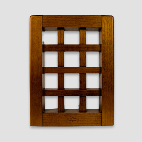 Sách dựng đứng được chèn từ 2 bên bởi hai tấm lưới gỗ.