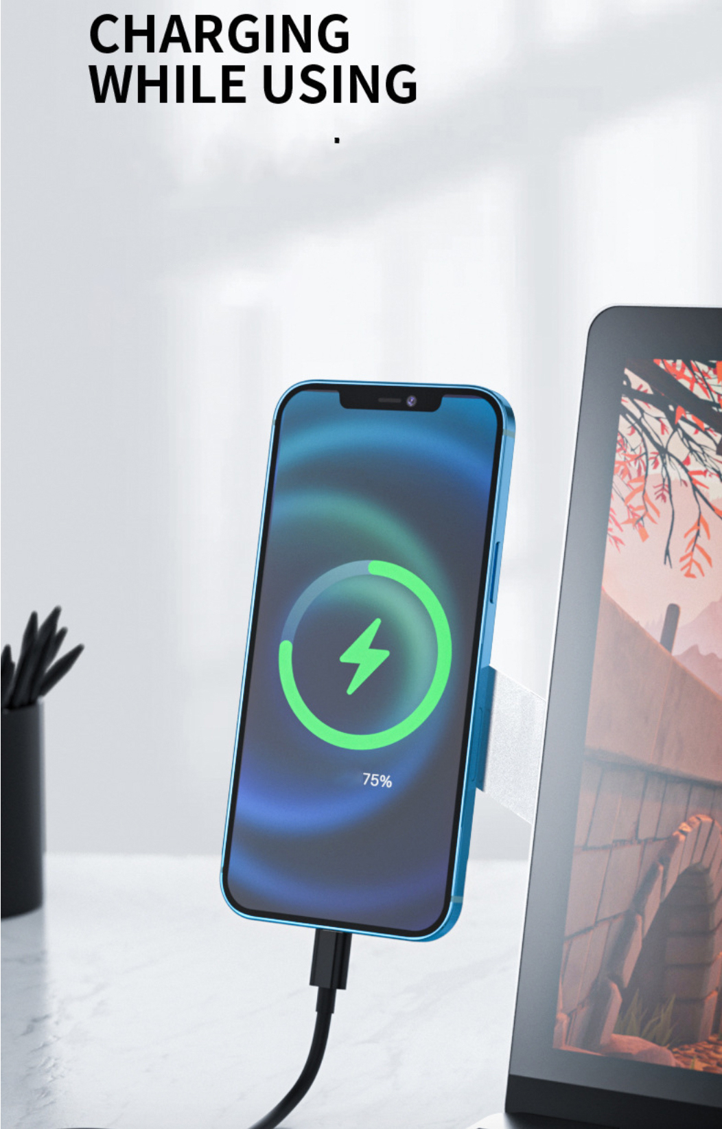 – là một sản phẩm độc đáo, tiện ích và hiện đại. Vừa đỡ điện thoại và vừa tích hợp sạc không dây mag-safe có thể sạc cho cả 3 thiết bị của Ap-ple. Bạn