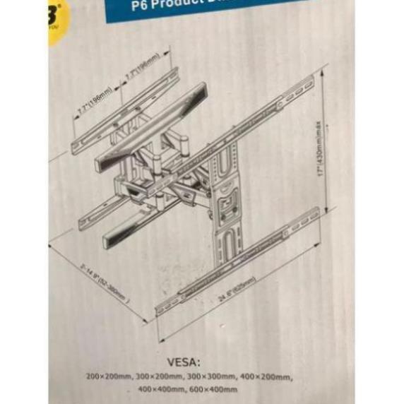 - Tải trọng: 45,5 kg Giá treo tivi góc xoay NB-P6 là loại giá treo được thiết kế đặc biệt dành cho các tv từ 45” – 75” inch với tâm lỗ từ 20x20cm và 60x40cm.