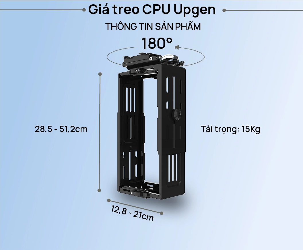 THÔNG SỐ KỸ THUẬT Thương hiệu: Upgen Tải trọng tối đa: 15 Kg Màu sắc: Đen Chất liệu: khung thép sơn tĩnh điện Kích thước: 230 x 205 x 435 mm Xoay: 180 độ Chiều ngang điều chỉnh: 128 – 210 mm Chiều cao điều chỉnh: 285 – 512 mm   Giá Treo Case Computers UPGEN Giá treo Case Computers UPGEN giúp bảo vệ an toàn cho CPU của Bạn. Gắn CPU ngay dưới bàn làm việc, giữ cho CPU không bị thiệt hại do tai nạn tràn hoặc bị lật. Giá treo Case Computers UPGEN là thiết bị văn phòng thông minh phù hợp với cuộc sống hiện đại ngày nay, giúp tối ưu diện tích sàn, dễ dàng vệ sinh và mang lại sự gọn gàng cho không gian làm việc, không chỉ là giá treo – Giá treo Case Computers UPGEN là phụ kiện thông minh mà META GEAR tự hào được giới thiệu đến Quý Khách Hàng THIẾT KẾ LINH HOẠT Thiết kế thay đổi kích thước với các khóa cài linh hoạt, Giá treo Case Computers UPGEN có khả năng mở rộng ra theo chiều ngang và chiều cao đáp ứng hầu hết các kích cỡ CPU thông thường Giá treo Case Computers UPGEN là một giải pháp bảo vệ an toàn và tối ưu diện tích cho góc làm việc với tính năng có thể điều cỉnh xoay lên đến 180 độ linh hoạt cho người dùng ở bất kỳ góc độ nào MÓC KHÓA KHOA HỌC Móc khóa treo khoa học giúp Bạn dễ dàng thao tác sau khi cố định CPU với Giá treo Case Computers UPGEN giúp cho CPU của bạn và bàn liệu một khối tránh rủi ro đứt dây, gãy đầu cổng kết nối khi bạn sơ ý di chuyển độ cao bàn. Ngoài ra, Giá treo Case Computers UPGEN giúp cho không gian bên dưới bàn được gọn gàng, thông thoáng và có thẩm mỹ hơn CHẤT LIỆU CAO CẤP Giá treo Case Computers UPGEN được chế tạo bằng hợp kim thép chịu lực, chắc chắn được mạ tĩnh điện theo công nghê cao với đặc tính chống oxi hóa tốt. CHỊU LỰC TỐT – DỄ DÀNG LẮP ĐẶT Giá treo Case Computers UPGEN có thể dễ dàng lắp ráp tại nhà, tính linh hoạt lắp đặt bằng nhiều hình thức như dưới gầm bàn, tường, vách chắc chắn chịu tải lên đến 15kg.