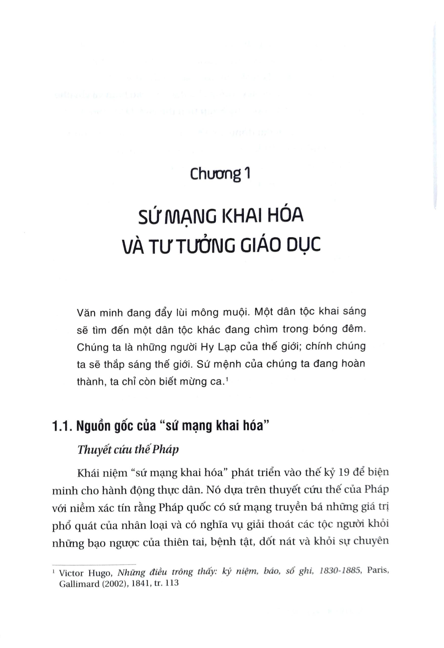 “Hai mô hình chủ đạo của nền giáo dục thuộc địa, hợp tác và đồng hóa, đối đầu nhau ở Đông Dương ngay từ cuối thế kỷ 19. Cuộc tranh luận này bắt đầu nổ ra với thuộc địa Algéria, nhưng Việt Nam tiền thuộc địa đã gây dựng và phát triển nền giáo dục khoa bảng trong ngàn năm mà nhà cầm quyền Pháp không thể lờ đi. Hai mô hình này không tiệt trừ nhau vì những tư tưởng thuộc địa và các chính sách áp dụng lên Đông Dương đều viện dẫn lúc thì mô hình này lúc lại mô hình kia, và nhất là chúng được thích nghi tùy vào thời cuộc và thực tế.”
