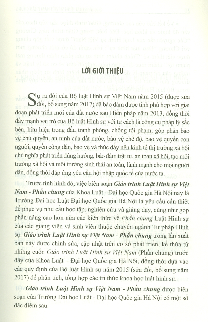 Mua tại TiktokGiáo trình Luật Hình sự Việt Nam - Phần chung Với sự phát triển và đòi hỏi của xã hội, cũng như nhằm phục vụ công tác học tập, nghiên cứu và giảng dạy, Trường Đại học Luật - Đại học Quốc gia Hà Nội đã xuất bản Giáo trình Luật Hình sự Việt Nam - Phần chung với sự tham gia biên soạn của các nhà khoa học luật hình sự có uy tín và những giảng viên có nhiều kinh nghiệm trong lĩnh vực tư pháp hình sự. Cuốn sách bạn đang cầm trên tay đã được tái bản lần thứ nhất có sửa đổi, bổ sung và cập nhật các tri thức mới của khoa học luật hình sự, nội dung các văn bản hướng dẫn thi hành Bộ luật Hình sự năm 2015, sửa đổi, bổ sung năm 2017. Cuốn sách tái bản lần này có một số điểm mới đáng chú ý so với bản in năm 2021:
